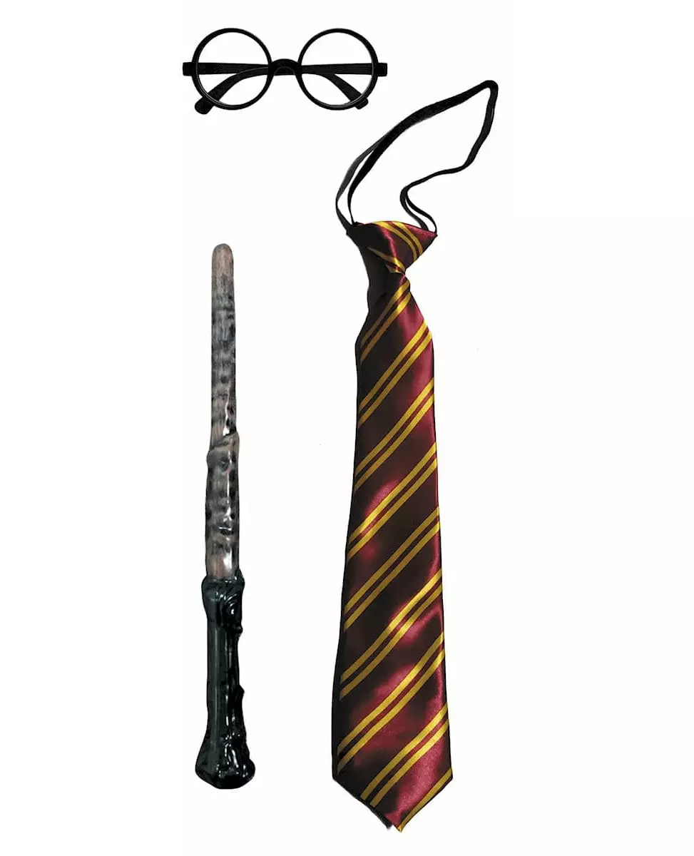 Klar for trollmannsskole! Dette trollmannsskolesettet består av et par briller, et slips og en tryllestav. Brillene er laget av svart plast med svarte innfatninger og stenger. Slipsen i satengstoff har en elastisk strikk for enkel bruk. Den er burgunderfarget med gullstriper. Plasttryllestaven er en imitasjon av en trollmannslærlingstav i tre. Den måler omtrent 34 cm i lengden. Dette trollmannslærlingstilbehørssettet vil være perfekt for et karneval eller en Halloween-fest. Inkludert tilbehør: 1 par briller, 1 slips, 1 tryllestav, Materiale: Polyester, plast,