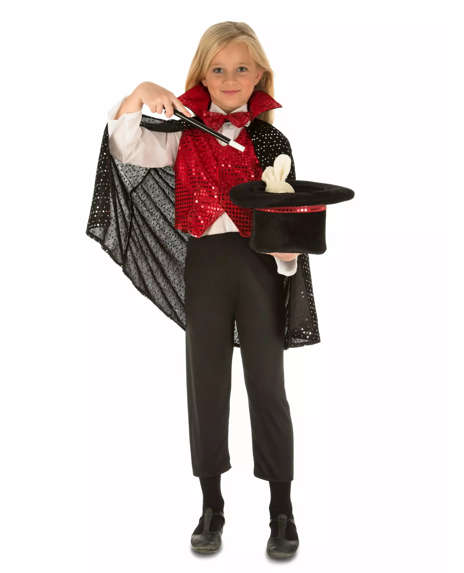 Bli den neste David Copperfield med dette tryllekunstnerkostymesettet! Dette kostymesettet med tryllekunstnertilbehør er for barn. Det inkluderer en vest, en kappe, en sløyfe, en hatt, en tryllestav og et plysjleketøy (skjorte, bukser og sko er ikke inkludert). Den ermeløse vesten er rød med store paljetter. Sløyfen er laget av samme stoff. Tryllekunstnerkappen er svart, med store paljetter også. Den har en hevet krage som er rød på innsiden. Hatten er en svart flosshatt med fløyelseffekt. En plysjkanin og en tryllestav fullfører dette kostymet. Dette svært komplette kostymet vil forvandle barnet ditt til en ekte tryllekunstner til en kostymefest. Inkludert tilbehør: Vest, sløyfe, kappe, hatt, kanin, plysjstav, materiale: 100 % polyester. Vedlikehold: Håndvask.