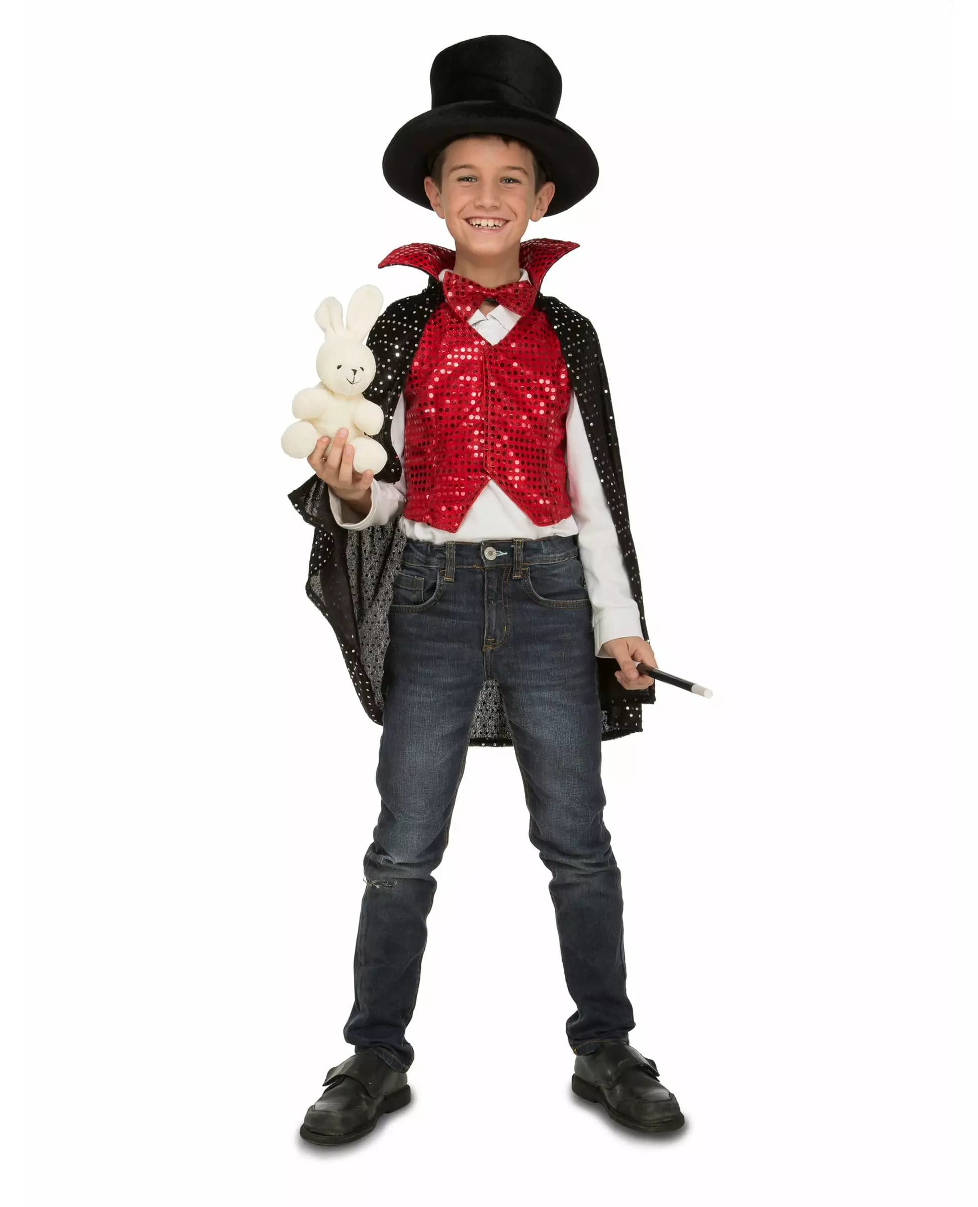 Bli den neste David Copperfield med dette tryllekunstnerkostymesettet! Dette kostymesettet med tryllekunstnertilbehør er for barn. Det inkluderer en vest, en kappe, en sløyfe, en hatt, en tryllestav og et plysjleketøy (skjorte, bukser og sko er ikke inkludert). Den ermeløse vesten er rød med store paljetter. Sløyfen er laget av samme stoff. Tryllekunstnerkappen er svart, med store paljetter også. Den har en hevet krage som er rød på innsiden. Hatten er en svart flosshatt med fløyelseffekt. En plysjkanin og en tryllestav fullfører dette kostymet. Dette svært komplette kostymet vil forvandle barnet ditt til en ekte tryllekunstner til en kostymefest. Inkludert tilbehør: Vest, sløyfe, kappe, hatt, kanin, plysjstav, materiale: 100 % polyester. Vedlikehold: Håndvask.