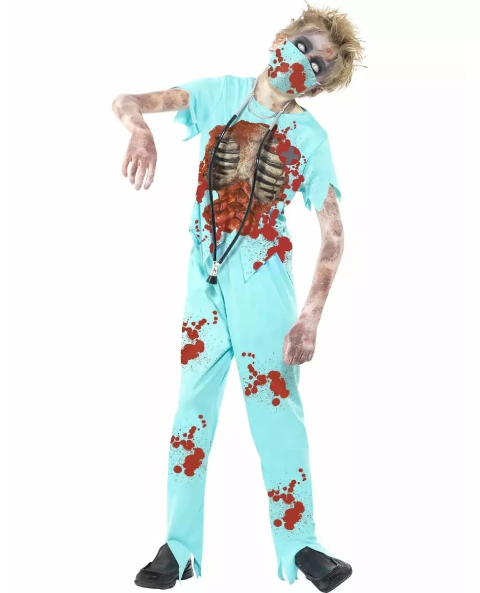 Bli en morbid kirurg! Dette zombiekirurgkostymet for barn består av en topp, bukser, en maske og et stetoskop (sko ikke inkludert). Den blå kortermede toppen er blodig og har et trykt brystkasse med gapende innvoller. Kantene er taggete. De blå buksene har en elastisk linning og er også flekket med blod. En blodig maske og et stetoskop fullfører antrekket. Masken holdes rundt ørene med elastiske bånd. Dette kostymet vil være perfekt for å spille zombiekirurg på en kostymefest eller til Halloween. Inkludert tilbehør: Maske Stetoskop Topp Bukser Materiale: 100 % polyester Vedlikehold: Håndvask
