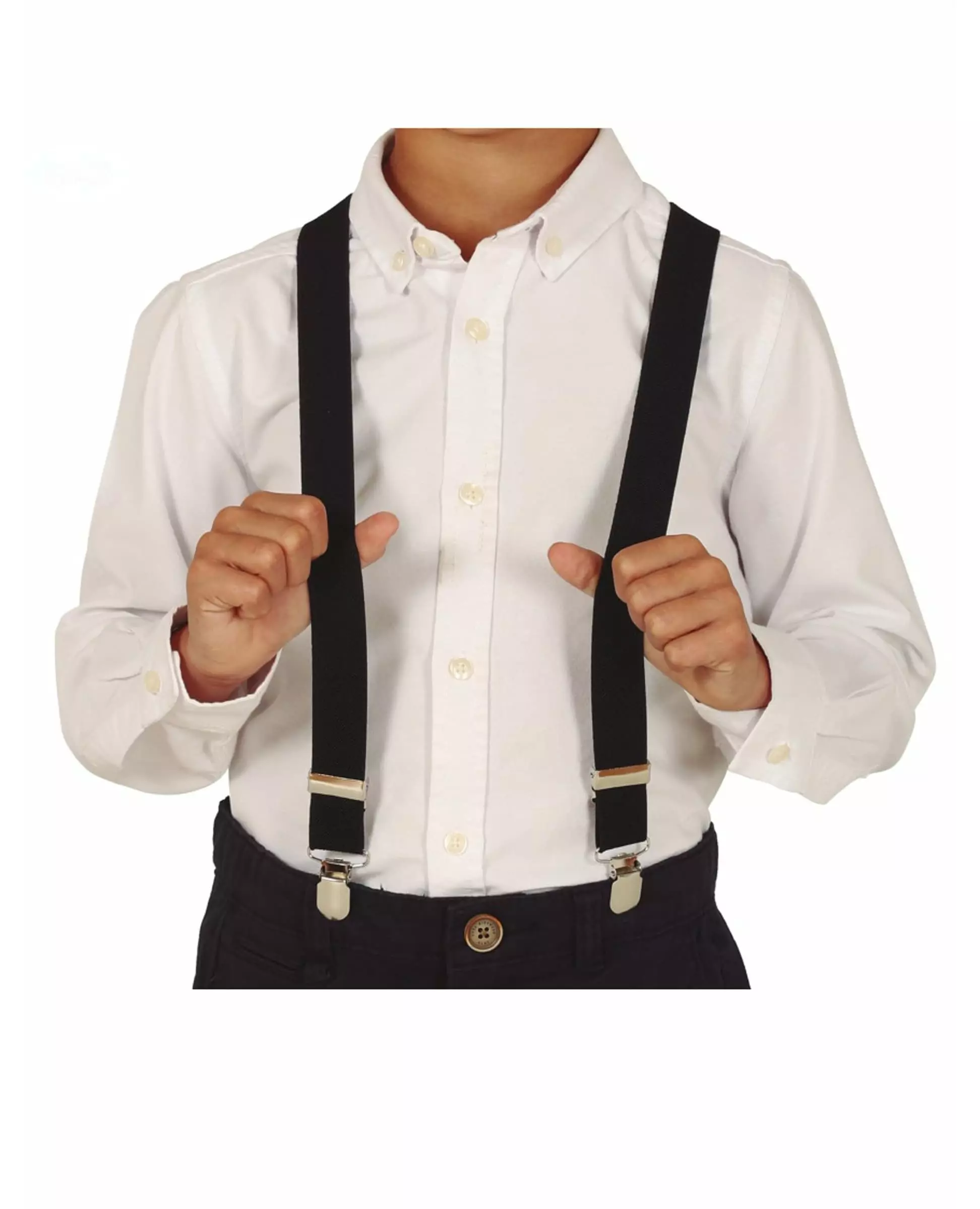 Svarte seler for et vintage-utseende! Dette paret med svarte seler er for barn. De er helt svarte med sølvdetaljer. De måler omtrent 55 cm i lengden og omtrent 3 cm i bredden. Disse svarte selene for barn er ideelle for å fullføre et gangster- eller vintage-skoleguttkostyme, og vil bli en sensasjon på en kostymefest! Inkludert tilbehør: Par seler