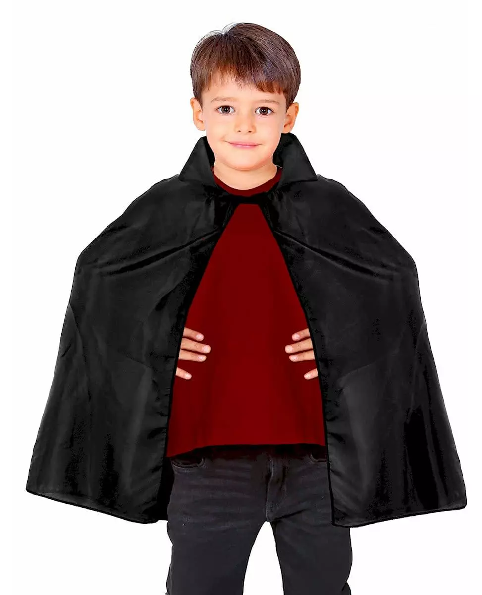 Den magiske kappen! Denne svarte kappen er for barn. Den måler omtrent 60 cm i lengden. Materialet er laget av satengstoff som vil gi antrekket ditt et stilig preg. Denne elegante kappen har en svart hevet krage og en enkel knyting som lukking. Denne kappen vil være perfekt for å kle seg ut som en tryllekunstner til Halloween- eller karnevalsfester! Inkludert tilbehør: Svart kappe Materiale: 100 % polyester Vedlikehold: Håndvask