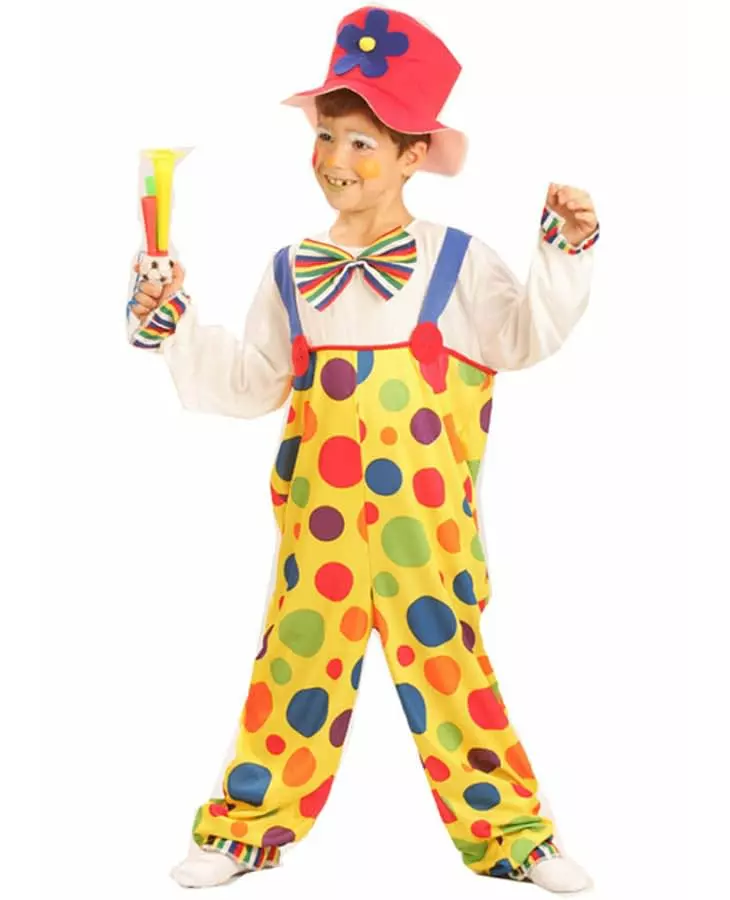Med blomsterhatt! Dette klovnekostymet for barn inkluderer en jumpsuit og en hatt (sko, parykk, ringer og trompet er ikke inkludert). Jumpsuiten har lange ermer og ben med strikk. Hele antrekket er i alle farger og bæres løst for en komisk effekt som er helt i tråd med bildet av klovnen. Antrekket fremkaller tydelig et par flerfargede prikkete kjeledresser på gul bakgrunn med blå bukseseler med røde knapper og en hvit t-skjorte med sløyfe. Den tykke filthatten er rød med en blå blomst. Den fullfører antrekket på en veldig morsom måte. For en bursdagsfest eller til karneval, vil dette fargerike kostymet gjøre barnet ditt til den mest bedårende sirkusartisten. Inkludert tilbehør: Jumpsuit-hatt Materiale: 100 % polyester Rens: Renseri