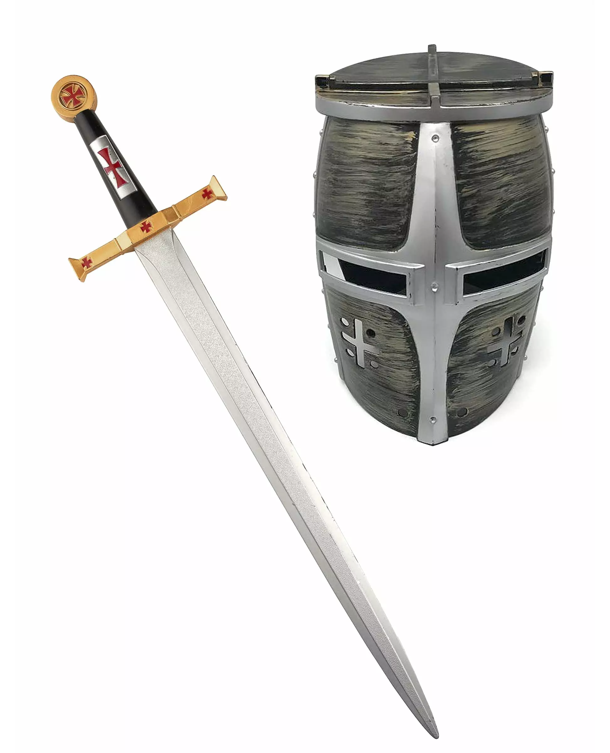 Barnas krigerriddersverd og hjelm til våpen. Dette barnesverdet og hjelmen er laget av plast.