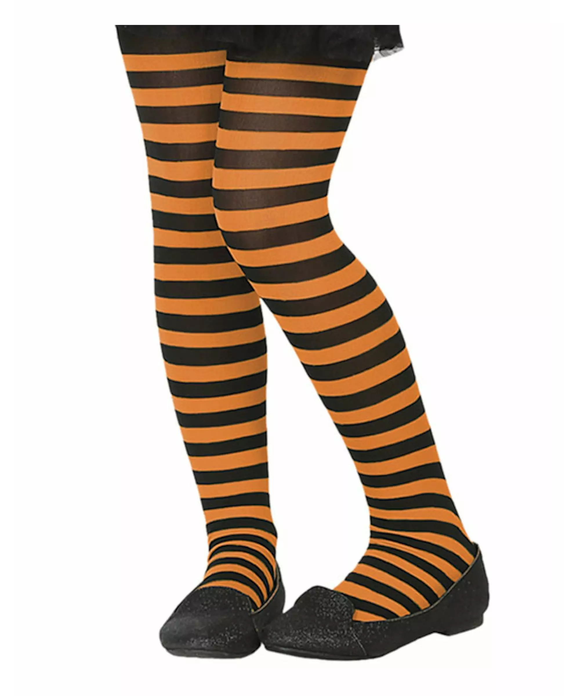 Våg å bruke striper med disse oransje og svartstripete strømpebuksene for barn! Disse barnestrømpebuksene har svarte og oransje striper. De vil være perfekte for en liten jente mellom 6 og 12 år. Disse strømpebuksene kan matche et gresskarantrekk til Halloween. Tilbehør inkludert: Strømpebukser