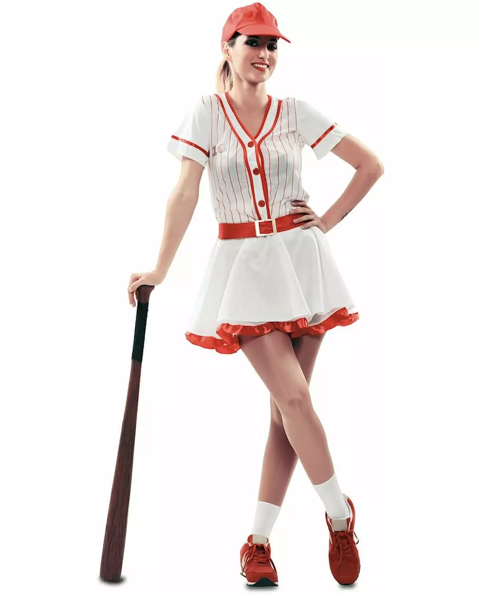 Klar for en vill kamp Dette baseballspillerkostymet for kvinner inkluderer en kjole med belte og en lue (balltre ikke inkludert). Kjolen imiterer en topp med skjørt og belte. Toppen av den kortermede kjolen er hvit med røde striper og pene røde knapper. Nederdelen av kjolen er en imitasjon av et hvitt, utsvingt skjørt med en pen satengrød kant. Det falske røde beltet med en falsk spenne gir en vakker finish. Baseballspillerluen er rød. Dette kostymet vil være perfekt for en sportstemafest! Inkludert tilbehør: Kjole med belte Lue Materiale: 100 % polyester Vedlikehold: Håndvask