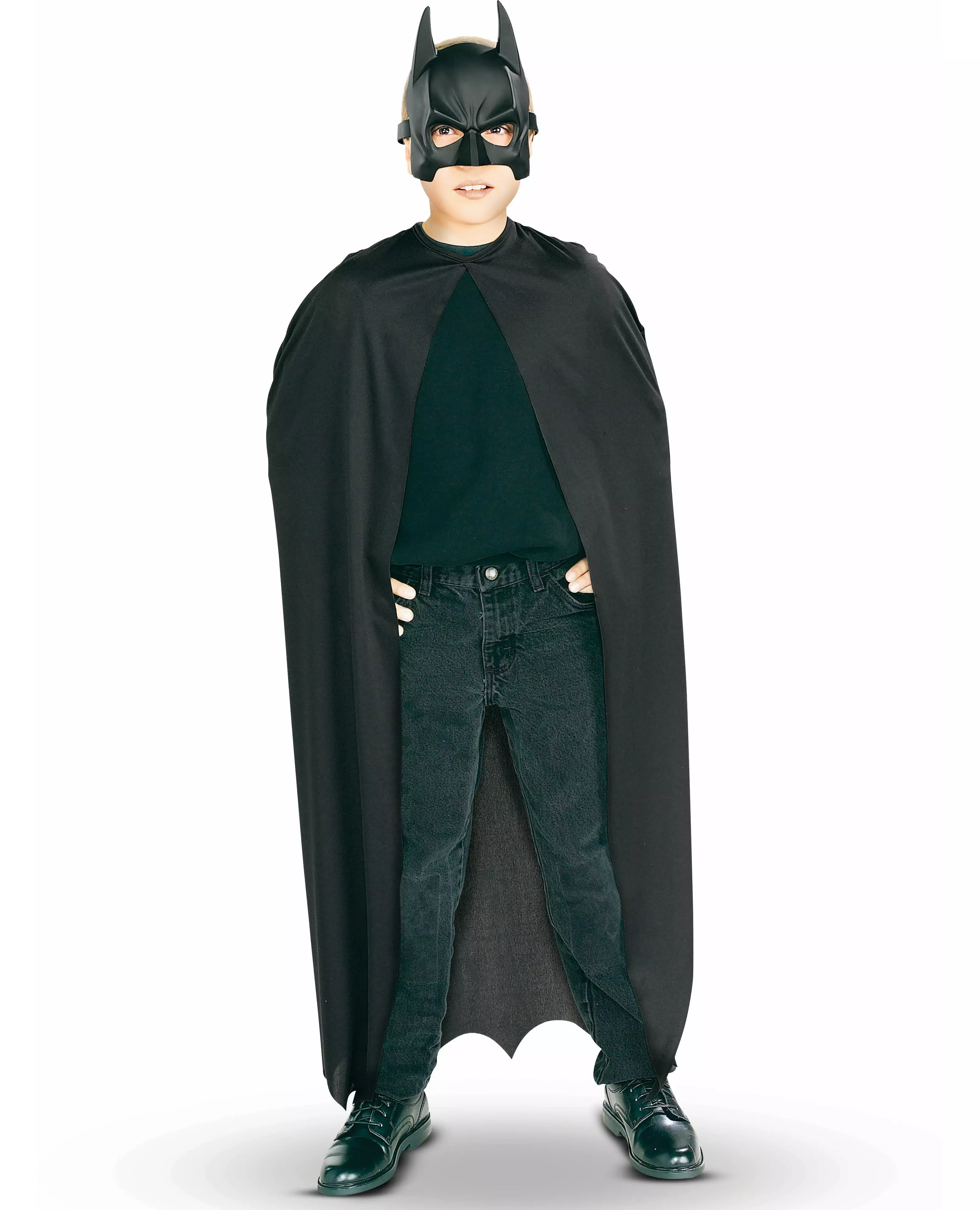 Veldig fin imitasjon! Dette offisielle Batman™-settet for gutter inkluderer en plastmaske som dekker halve ansiktet og en 110 cm lang kappe. Den lette stoffkappen er svart. Dette settet er ikke egnet for barn under 4 år (klær ikke inkludert). Perfekt for å gjøre barnet ditt til en ekte helt på karneval eller en bursdagsfest. Inkludert tilbehør: Kappemaske Materiale: Kappe: 100 % polyester / Maske: PVC Pleie: Renseri
