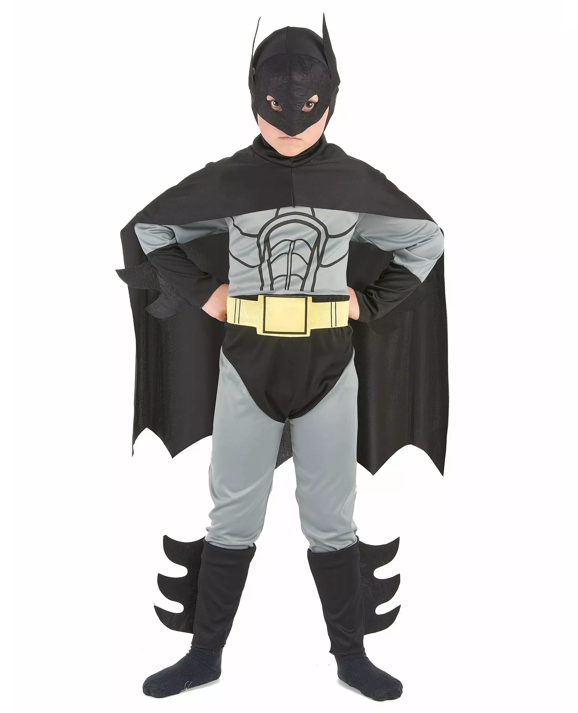 Ta rettferdigheten i egne hender i dette superheltkostymet. Dette flaggermus-superheltkostymet for gutter består av en jumpsuit, en maske med kappe og et belte (sko ikke inkludert). Den grå jumpsuiten har svarte muskeltrykk på overkroppen. For enklere påkledning har den borrelåslukking øverst på ryggen. Nederdelen av ermene og bena er svarte, med små pigger på sidene. Et gult belte gir et fargerikt preg til dette kostymet. Det festes med borrelås. En svart hette med kappe vil fullføre superheltantrekket ditt. Dette kostymet har spisse ører på sidene samt åpninger ved øynene. Dette kostymet vil være perfekt for å legemliggjøre flaggermusmannen og for å få rettferdighet til å råde under karnevalet. Inkludert tilbehør: Jumpsuit Hette med kappe Belte Materiale: 100 % polyester Vedlikehold: Håndvask