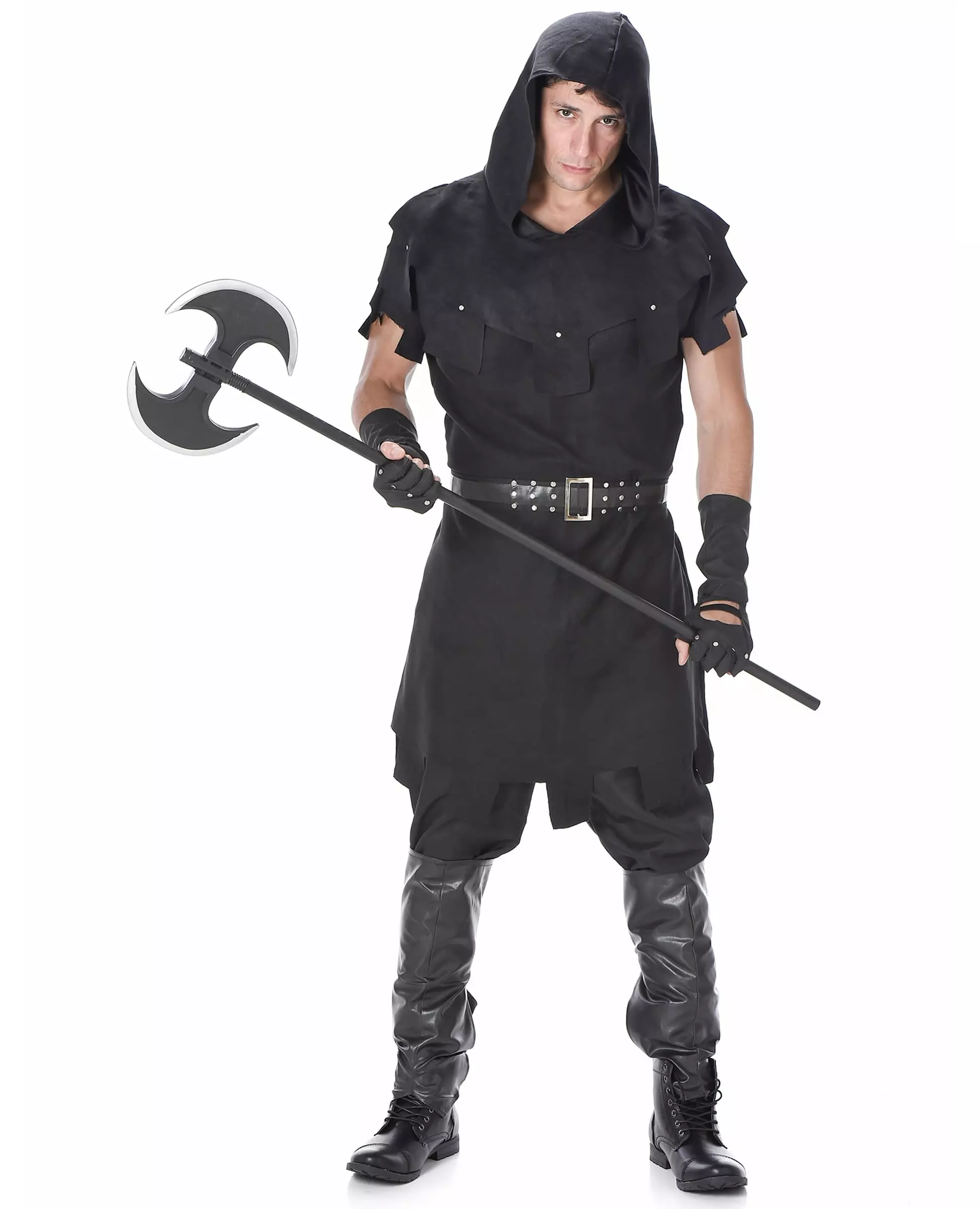 Forvandle deg til en bøddel i dette mørke kostymet. Dette bøddelkostymet for menn består av en tunika, et belte, et par votter og skoovertrekk. Den svarte tunikaen med skinneffekt har korte ermer og hette. Den lukkes øverst bak med borrelås. Den kompletteres av et belte, som også lukkes bak med borrelås. De lange vottene er svarte. De er åpne på toppen av hendene. Støvlene er svarte. De har skinneffekt foran og er laget av svart stoff bak. De holdes under føttene med en strikk. Dette kostymet vil være perfekt for å skremme vennene dine på Halloween-kvelden. Inkludert tilbehør: Tunika Belte 2 Hansker 2 Skoovertrekk Materiale: 100 % polyester Pleie: Håndvask Målinformasjon: For størrelse M er tunikaen omtrent 102 cm lang (uten hette)