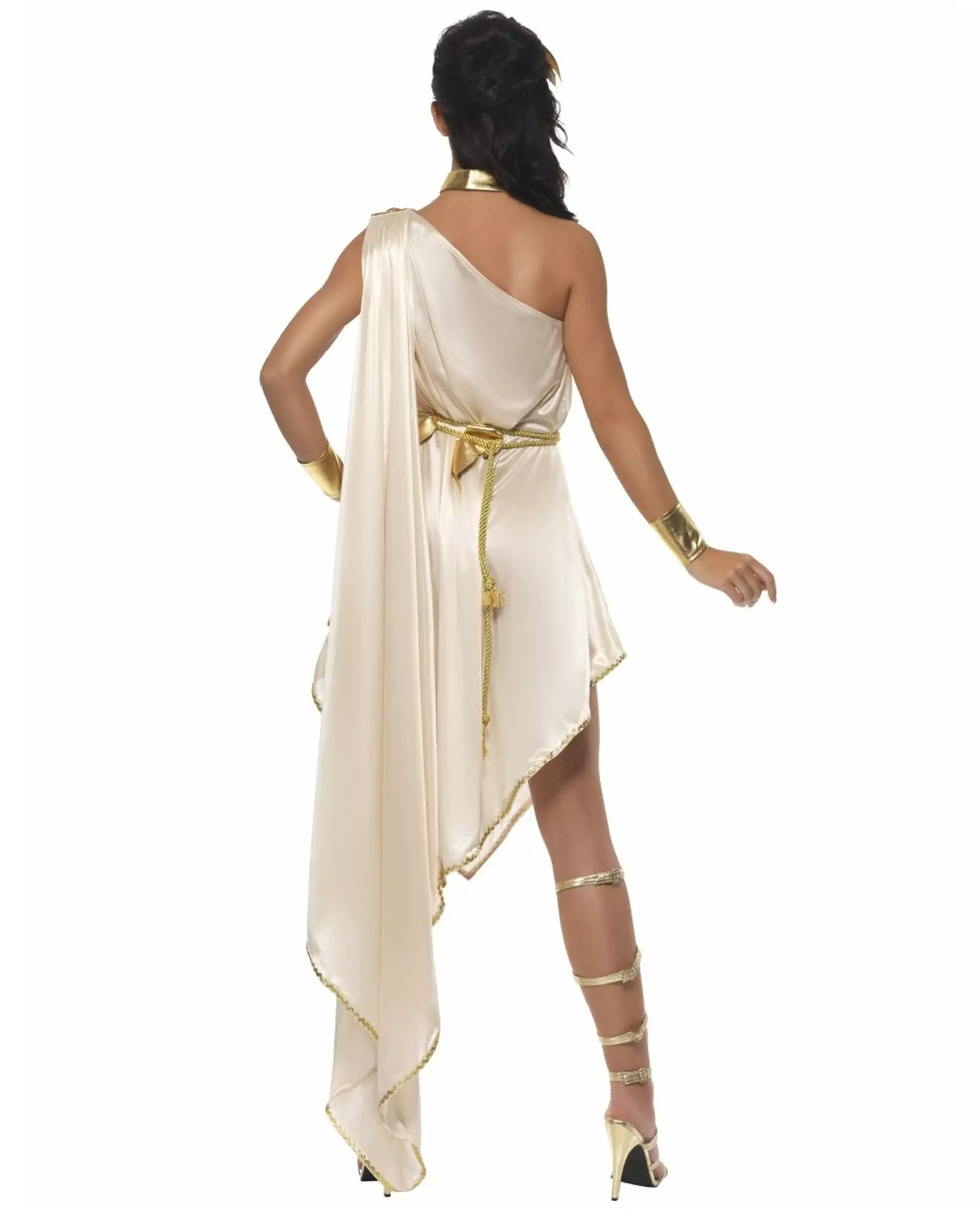 Bli med på en peplum-fest i dette gudinnekostymet. Dette greske gudinnekostymet består av en kjole, et pannebånd, et belte, et par armbånd og et halskjede (sko ikke inkludert). Den beige kjolen er kort og asymmetrisk, i et skinnende beige stoff. Nederdelen av kjolen er foret med en gullflette. En lang kappe er sydd på skulderen. Pannebåndet er dekket av beige stoff. Det er dekorert med en gullblomst i imitert skinnstoff. Et belte lar deg feste kjolen. Dette beltet er laget av et gyllent tau hvor det er noen gyldne blader i imitert skinnstoff. Chokeren og armbåndene er gullfargede. De lukkes enkelt med borrelås. Dette gudinnekostymet vil være perfekt for å delta på en gresk-romersk kveld eller feire på karnevalet. Inkludert tilbehør: Kjole Pannebånd Belte Halskjede 2 armbånd Materiale: 100 % polyester Vedlikehold: Håndvask
