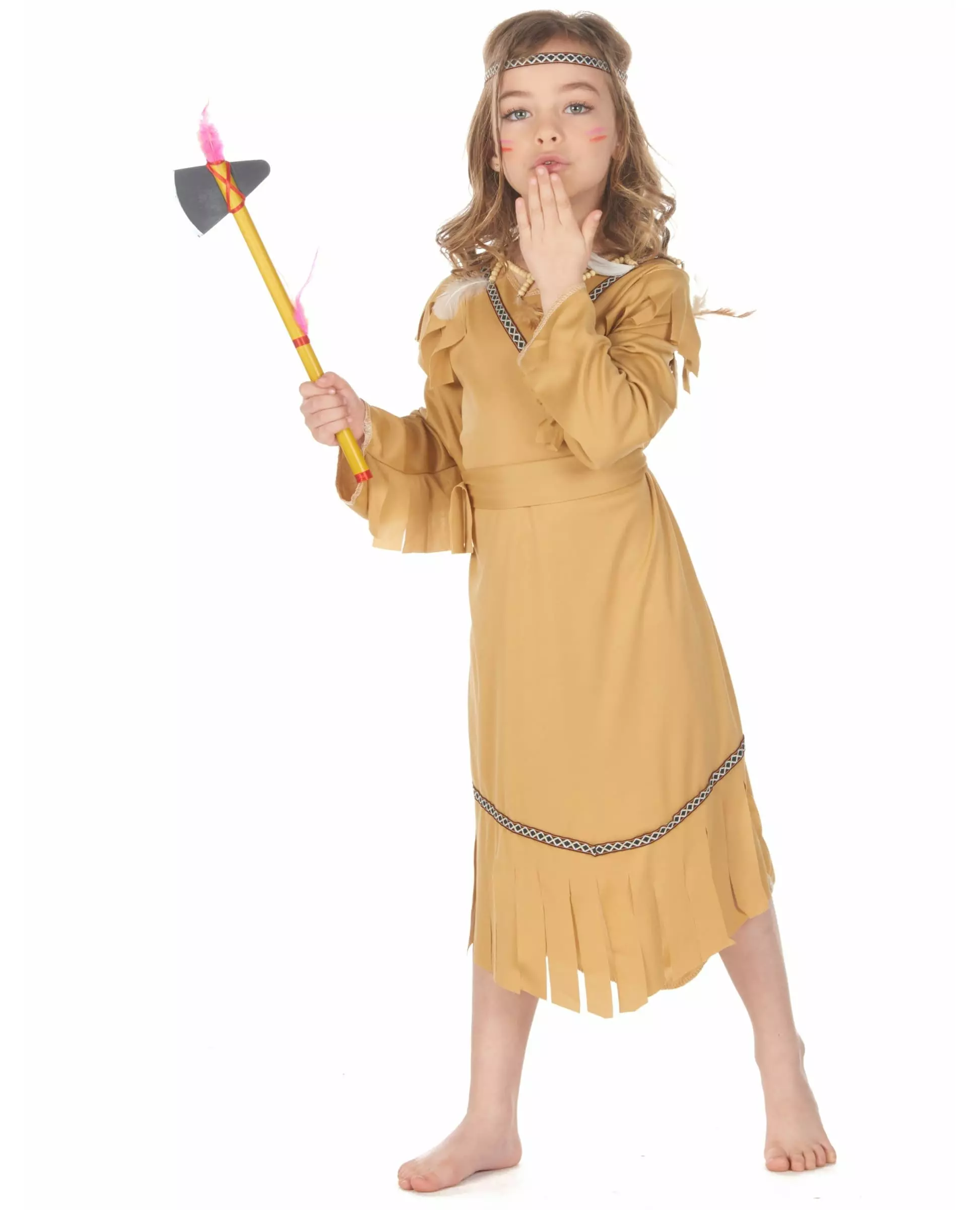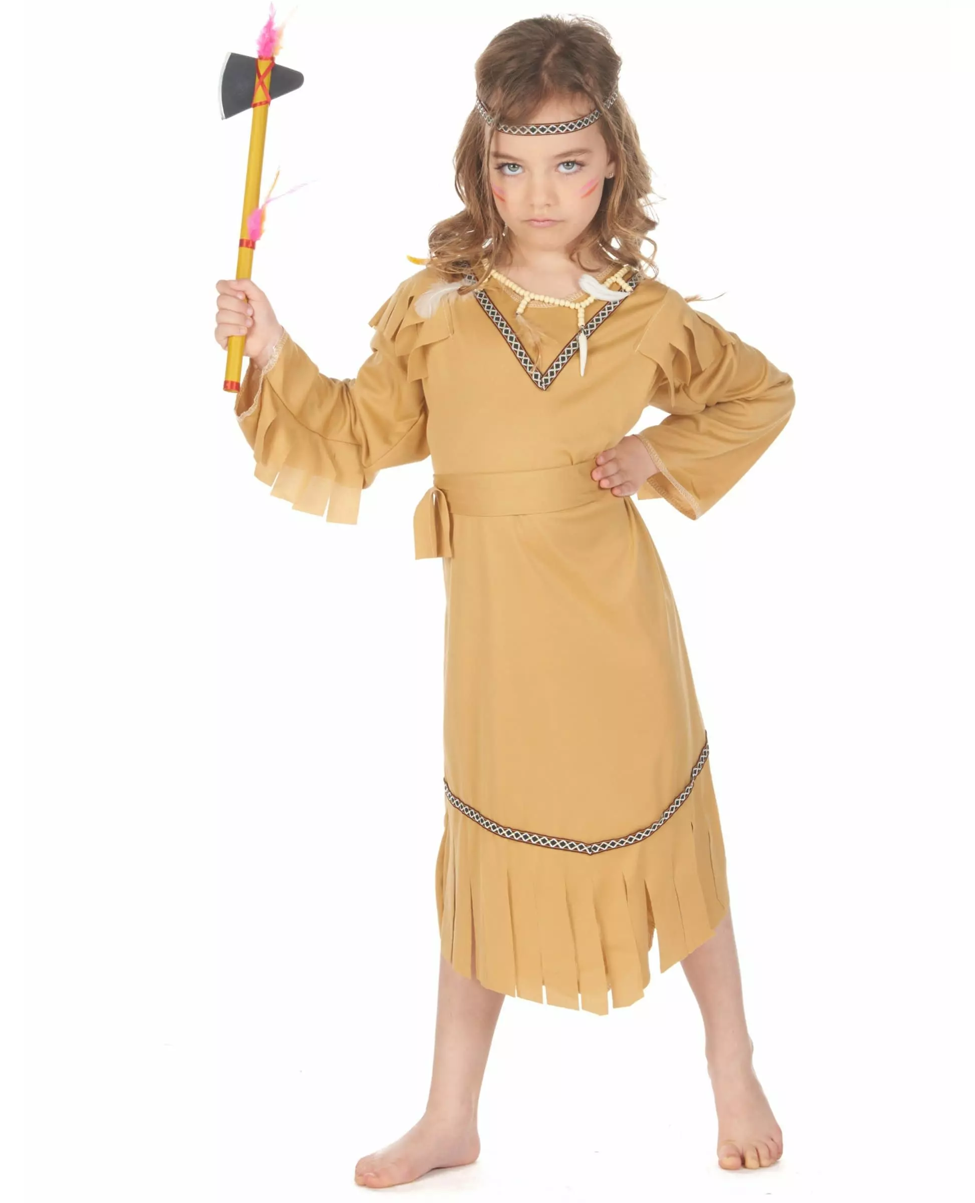 Legemliggjør en ekte indianer med dette komplette kostymet. Dette indianerkostymet for jenter består av en kjole, et stoffbelte og et pannebånd. (Spyd og fjær er ikke inkludert). Kjolen er beige. Den er dekorert med beige frynser på ermene og nederst på skjørtet. Den er også dekorert med en geometrisk mønstret kant på torso og skjørt. Et belte og pannebånd som matcher kjolen fullfører settet. Dette indianerkostymet vil være perfekt for et show, karneval eller til og med en bursdagsfest med cowboy- og indianertema. Inkludert tilbehør: Kjole, belte, pannebånd. Materiale: Polyester. Stell: Håndvask. Målinformasjon: For størrelse 4/6 år, 79 cm lang med frynser og 38 cm bred ved skuldrene.