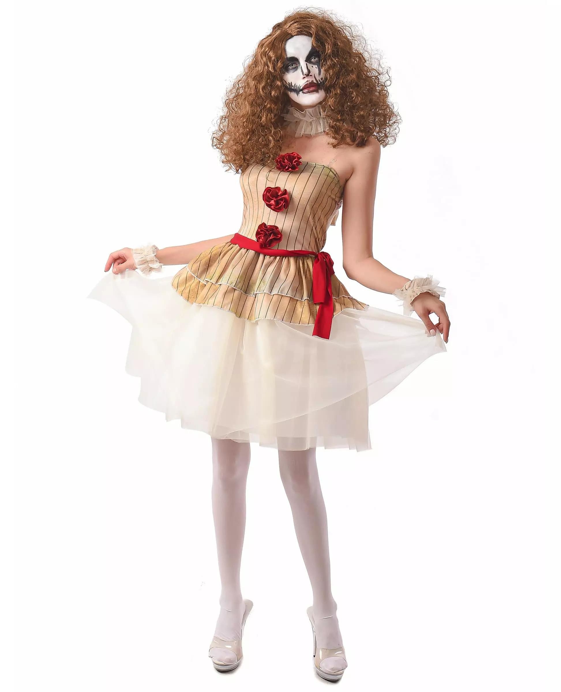 En skummel klovn! Dette skremmende klovnekostymet for kvinner består av en kjole, et belte, en choker og armbånd (parykk, strømpebukser og sko er ikke inkludert). Kjolen er beige med svart kant. Den er dekorert med 3 røde pomponger. Nederdelen av kjolen er laget av et slør. Et rødt belte knytes i livet. Armbåndene og tyllchokeren gir et snev av realisme. Skrekk vennene dine med dette skumle klovnekostymet på Halloween-festen din!. Inkludert tilbehør: Kjole Halsbånd Belte Armbånd Materiale: 100 % polyester Vedlikehold: Håndvask