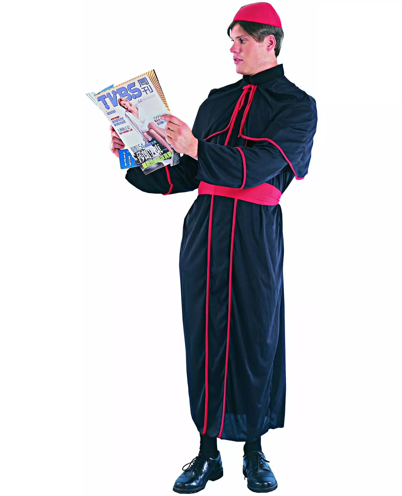 Forvandle deg til en biskop! Dette biskopkostymet for menn består av en kjole, et belte og en hatt (bok, bukser og sko er ikke inkludert). Den langermede kjolen er svart med en liten kappe og rød kant. Beltet og hatten er røde. Dette kostymet vil være perfekt for karneval eller en utkledningsfest. Inkludert tilbehør: Kjole Belte Hatt Materiale: 100 % polyester Vedlikehold: Håndvask