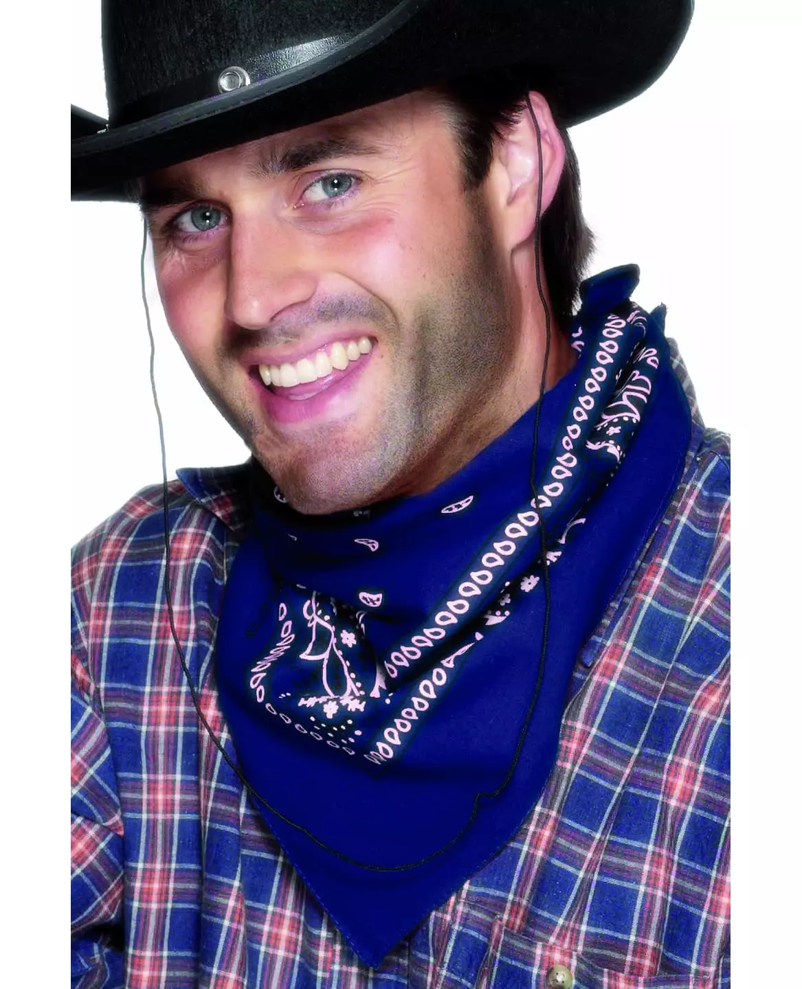 Retroeffekt! Denne bandanaen, typisk for cowboys eller Route 66-entusiaster, er blå med et paisleymønster. Den måler omtrent 54 x 54 cm. Det er det ideelle tilbehøret for å fullføre biker- eller cowboykostymet ditt, under en temafest eller et karneval. Inkludert tilbehør: Bandana Materiale: 100 % bomull Pleie: Håndvask