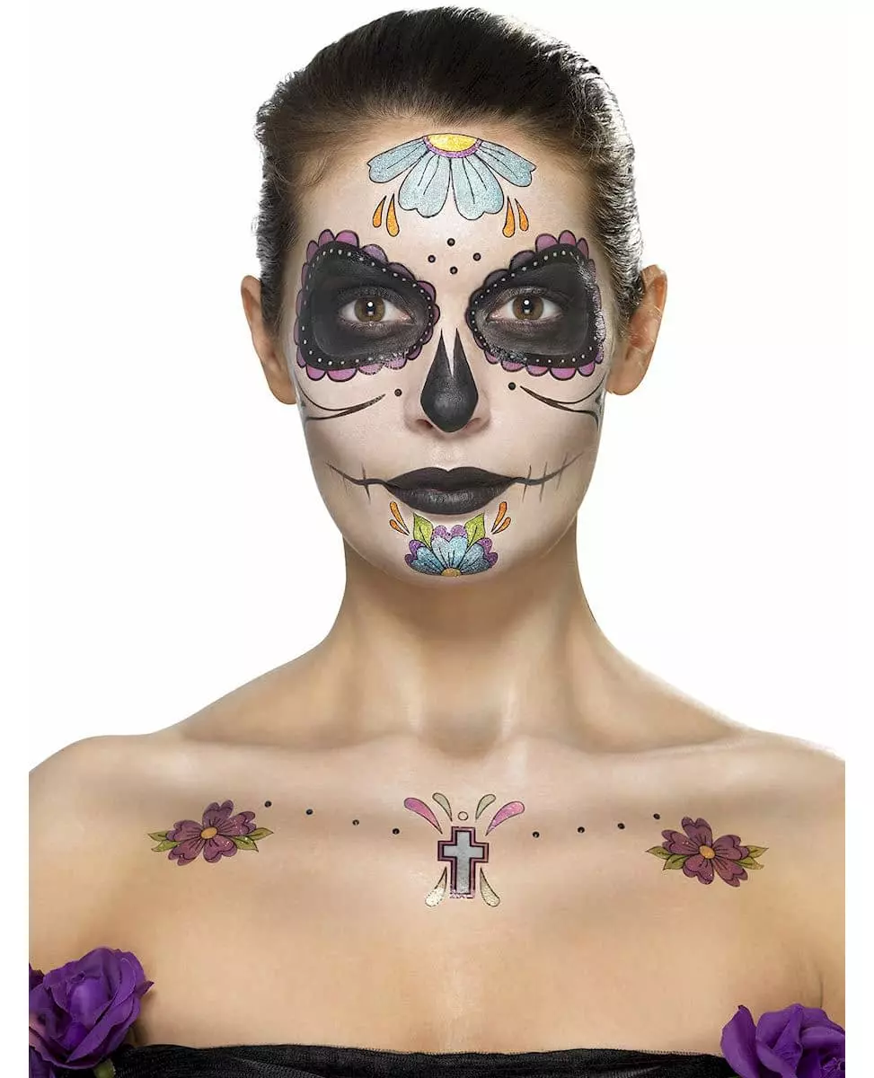 Til Halloween, velg en Dia de los Muertos-sminke. Dette fantastiske Dia de los Muertos-sminkesettet inneholder alt du trenger for å gjenskape en «sukkerskalle»-ansiktssminke, en fargerik meksikansk hodeskalle. Settet inkluderer svart og hvit sminke, 9 tatoveringer, svarte steiner, en svart sminkeblyant, en svamp og en børste, slik at du kan påføre sminken profesjonelt. Med dette sminkesettet blir du den vakreste Calaveraen på Halloween-kvelden. Inkludert tilbehør: Svart og hvit øyenskygge, 9 tatoveringer, steiner, blyant, svamp, børste.