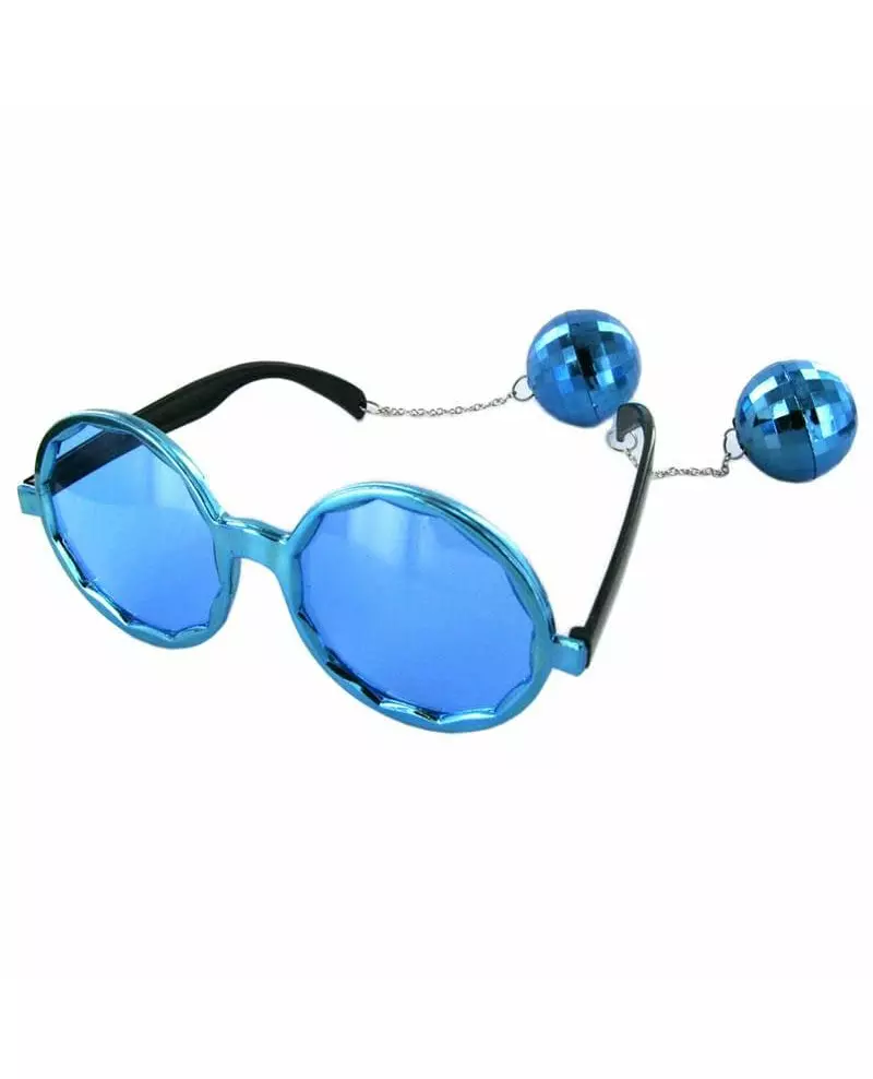 Lek med farger til discokostymet ditt Disse blå discobrillene for voksne er metallisk blå i fargen. Runde i formen, har blåtonede plastlinser. To små fasetterte kuler er festet til endene av stengene med en kjede. Disse brillene vil være det ideelle tilbehøret for å fullføre discokostymet ditt under en 80-tallsfest. Inkludert tilbehør: Briller Materiale: Plast