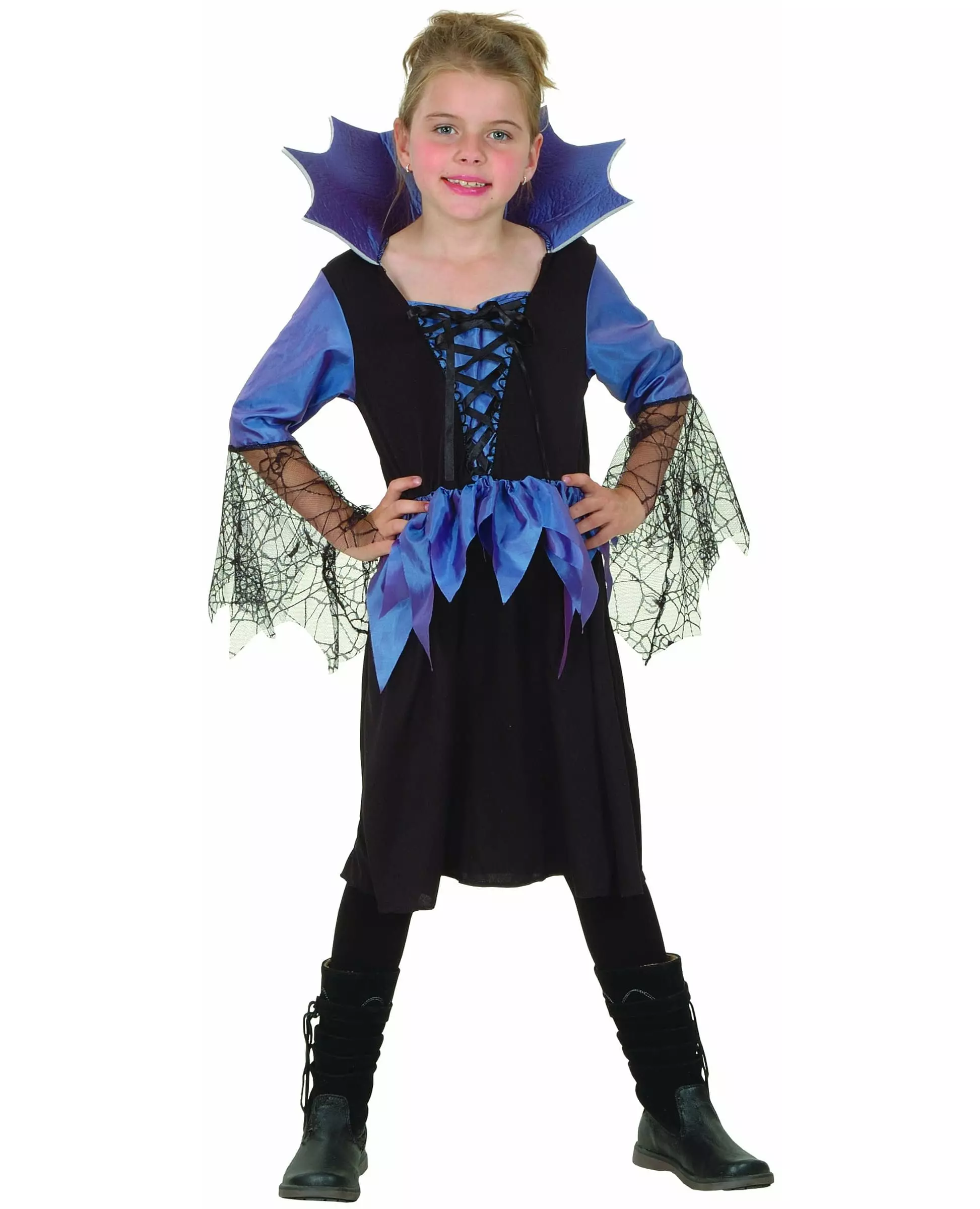 Gjør deg klar til å gå på knask eller knep! Dette edderkoppdronningkostymet for jenter består av en kjole (sko ikke inkludert). Kjolens overdel er svart med en liten snøring foran. Ermene er blå med utsvingte bunn. Den utsvingte delen av ermene er laget av svart tyll med spindelvevmønstre og er kuttet i spisser. En bred piggete krage er også tilstede. Denne er blå på innsiden og lilla på utsiden. Kjolens underside er svart med blå pigger i livet. Midjen er elastisk for økt komfort. Dette kostymet vil være perfekt for å forvandle seg til en edderkoppdronning og gå på knask eller knep på Halloween-kvelden. Inkludert tilbehør: Kjole Materiale: 100 % polyester Pleie: Håndvask