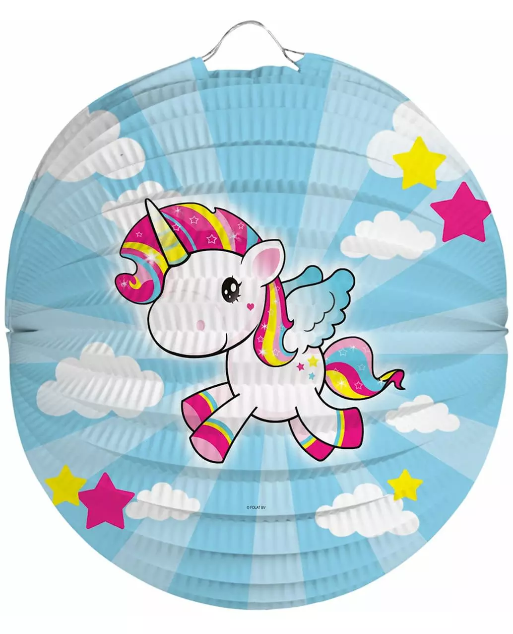 En magisk lykt! Denne enhjørningslykten er laget av papir. Den måler omtrent 22 cm i diameter. Denne papirlykten er blå. Den er dekorert med en søt liten enhjørning som flyr på himmelen. Denne magiske skapningen er ledsaget av skyer og stjerner. Du kan enkelt henge den opp takket være en liten krok på toppen. Denne praktfulle enhjørningspapirlykten vil fortrylle alle. Den er perfekt for å dekorere en enhjørningstemafest. Inkludert tilbehør: 1 lykt Materiale: Papir