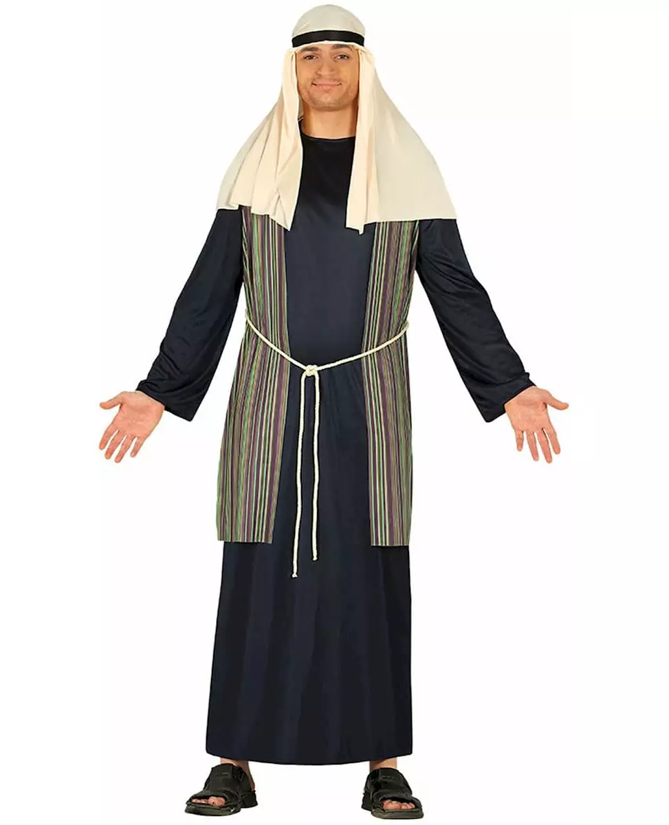 En julekrybbe-gjeter Dette blå gjeterkostymet for menn består av et hodeplagg, en tunika og belte. Hodeplagget er laget av et langt off-white stoff med svart omriss. Den lange tunikaen er midnattsblå med en imitasjonsvest med fargerike striper på. Til slutt er et hvitt snorbelte til å knyte rundt livet inkludert. Dette blå gjeterkostymet vil være perfekt for å legemliggjøre en berømt julekrybbe-figur. Inkludert tilbehør: Hodeplagg Tunika Belte Materiale: 100 % polyester Vedlikehold: Håndvask