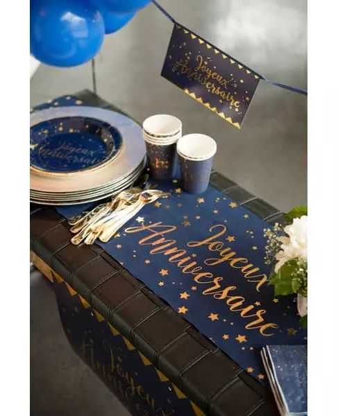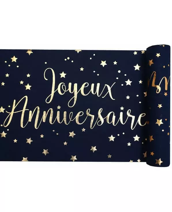 Blå og gullfarget bordløper i bomull med gratulerer med dagen-motiv, 28 cm x 3 m