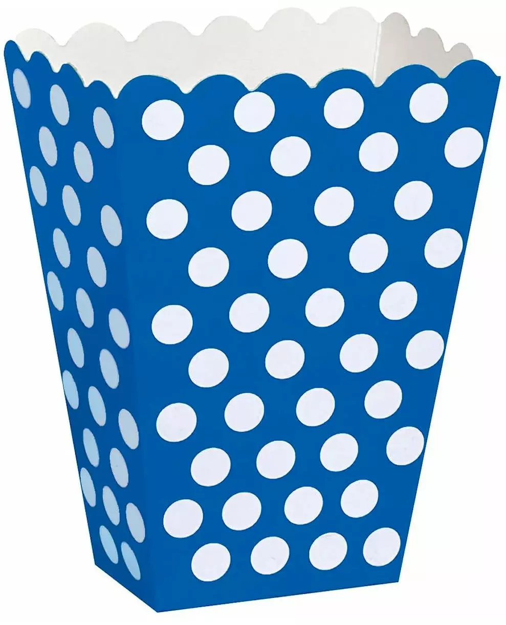 8 blå popcornbokser med hvite prikker En filmkveld i retrostil. Reis tilbake i tid med disse popcornboksene i retrostil, blå med hvite prikker.