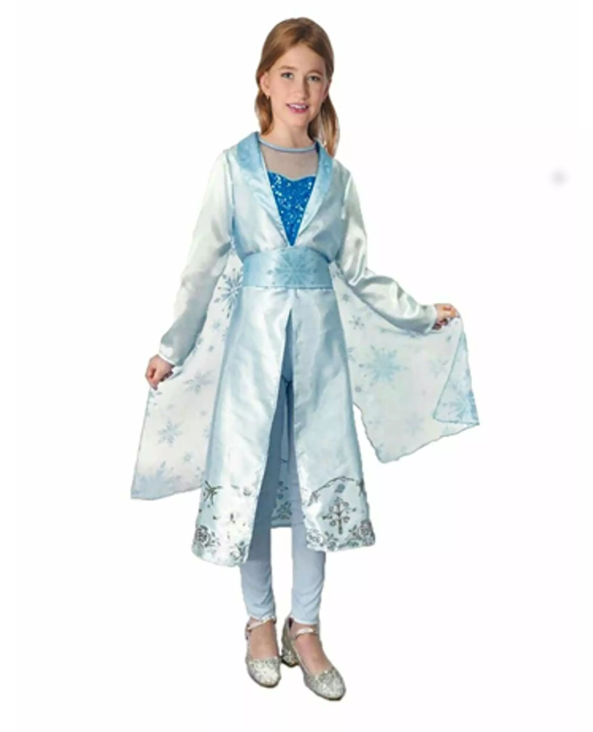 En Prinsesse fra Kulden Dette blå prinsessekostymet fra det fjerne nord er for jenter. Det inkluderer en jakke, en t-skjorte, leggings og et belte. Jakken er laget av himmelblått satengstoff. Sølvmønstre er brodert nederst på jakken. En kappe laget av himmelblått gjennomsiktig slør og flokket med blå glittersnøflak er sydd til jakken. Et belte er plassert på jakken for en kvalitetsfinish. En t-skjorte laget av blå paljetter med en gjennomsiktig slørkrage samt himmelblå leggings er også inkludert for å fullføre dette Dronningen av det fjerne nord-kostymet. Med dette Prinsesse fra det store nord-kostymet for jenter vil det være perfekt for å forvandle datteren din på karnevalsdagen eller til en bursdag med temaet tegneserieprinsesser. Tilbehør inkludert: jakke T-skjorte Leggings Belte Materiale: 100 % polyester Vedlikehold: Håndvask