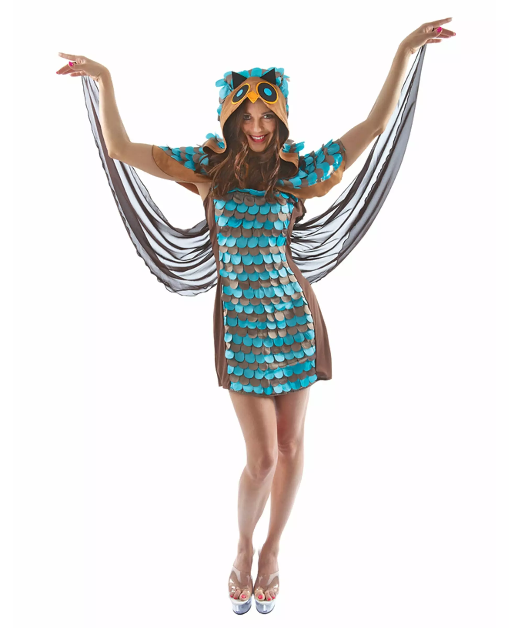 Flott nattfugl! Dette uglekostymet er for kvinner. Det består av en kjole med to store tyller og en hette (sko ikke inkludert). Den blå og brune kjolen er dekket med falske fjær på skuldrene, foran på kjolen og hetten. To store biter av gjennomsiktig, brunt stoff er sydd på baksiden for å imitere vingene. I endene av disse vingene finner du to små hull som du kan stikke fingrene gjennom for å holde de to sidene av vingene perfekt. Til slutt representerer hetten med to små runde øyne og et nebb uglehodet. Velg dette uglekostymet til din neste kostymefest eller til karneval! Inkludert tilbehør: Kjole med vinger og hette, Materiale: 100 % polyester,