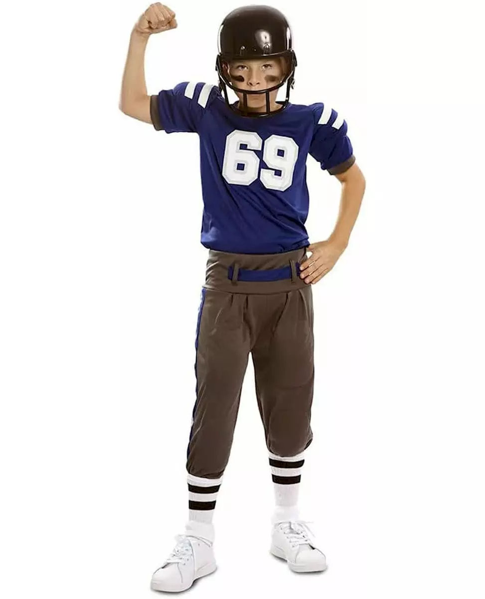 De store kampene er dine i dette amerikanske fotballspillerkostymet. Dette amerikanske fotballspillerkostymet for barn består av en topp og bukser (hjelm, sokker og sko er ikke inkludert). Toppen er blå, med hvite striper på skuldrene og nummer 69 foran. Skuldrene er polstret for å best representere uniformen til disse utøverne. Buksene er grå med et falskt blått belte. Den når toppen av leggene. Dette kostymet vil være perfekt for å forvandle barna dine til lærlinger i amerikanske fotballspillere til karnevalet. Inkludert tilbehør: Topp Bukser Materiale: 100 % polyester Pleie: Håndvask