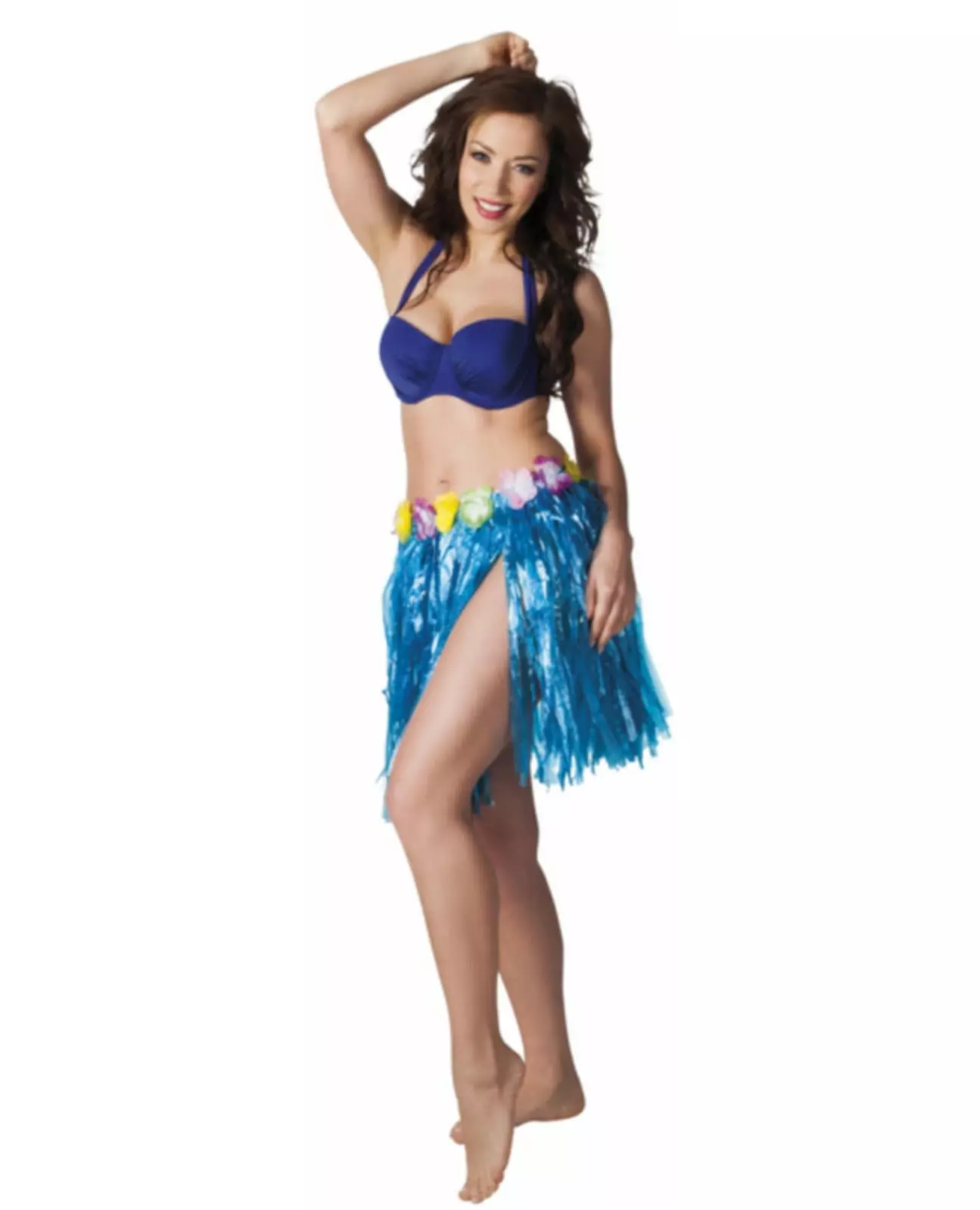 Uunnværlig for ethvert hawaiisk kostyme Dette korte hawaiiske skjørtet er for voksne (topp og tilbehør er ikke inkludert). Det måler omtrent 45 cm i lengden. Det er laget av tynn blå plast. Det er elastikk i midjen for økt komfort når det brukes. Flerfargede blomster pryder også midjen på dette skjørtet. Dette skjørtet vil være ideelt for å fullføre et hawaiisk kostyme og gi et fint preg av farge og friskhet til antrekket ditt under dine hawaiisk-temafester. Inkludert tilbehør: Skjørt Materiale: Plast