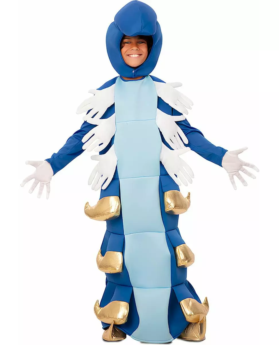 Larven som ville i parade! Dette blå larvekostymet for barn består av en vattert jumpsuit, hette, hansker og matchende skoovertrekk. Jumpsuiten, i kontrastfarger kongeblå og himmelblå, fremkaller utseendet til en larve. Hvite stoffhender og polstrede gylne ben er sydd på sidene, noe som minner om den berømte larven fra en fantastisk og sprø fortelling. Den blå hetten fullfører silhuetten med en avrundet form som minner om larvens hode, og etterlater ansiktet godt eksponert. De hvite hanskene og de gylne skoovertrekkene forener hele antrekket for en fullstendig forvandling. Perfekt for et karneval, en kostymefest eller for å bli med i en verden inspirert av fantastiske fortellinger. Inkludert tilbehør: 1 jumpsuit 1 hette 1 par hansker 1 par skoovertrekk Materiale: 100 % polyester Vedlikehold: Håndvask