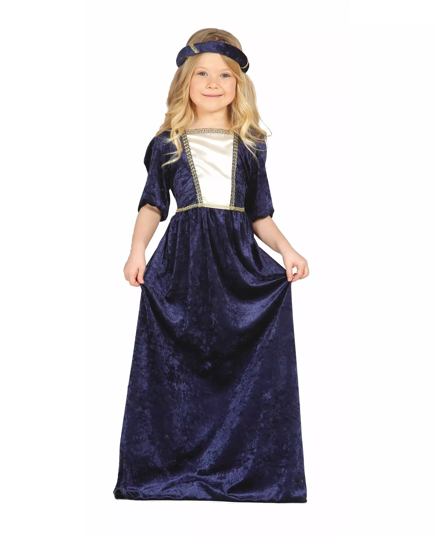 Alt du vil savne er din ridder i skinnende rustning! Dette blå middelalderkostymet for jenter består av en kjole og et pannebånd. Den marineblå kjolen med fløyelseffekt er lang og har korte ermer og en firkantet krage. Den er dekorert med gullkant og et hvitt satengstoff foran, noe som gjør den veldig elegant! En strikk i midjen lar deg stramme kjolen. Det marineblå pannebåndet med fløyelseffekt har de samme gullmønstrene som kjolen. Det er polstret og vil derfor være veldig behagelig å ha på seg. Dette kostymet vil være perfekt for å forvandle datteren din til en elegant middelalderdame på karnevalet! Inkludert tilbehør: Kjolepannebånd Materiale: 100 % polyester Vedlikehold: Håndvask