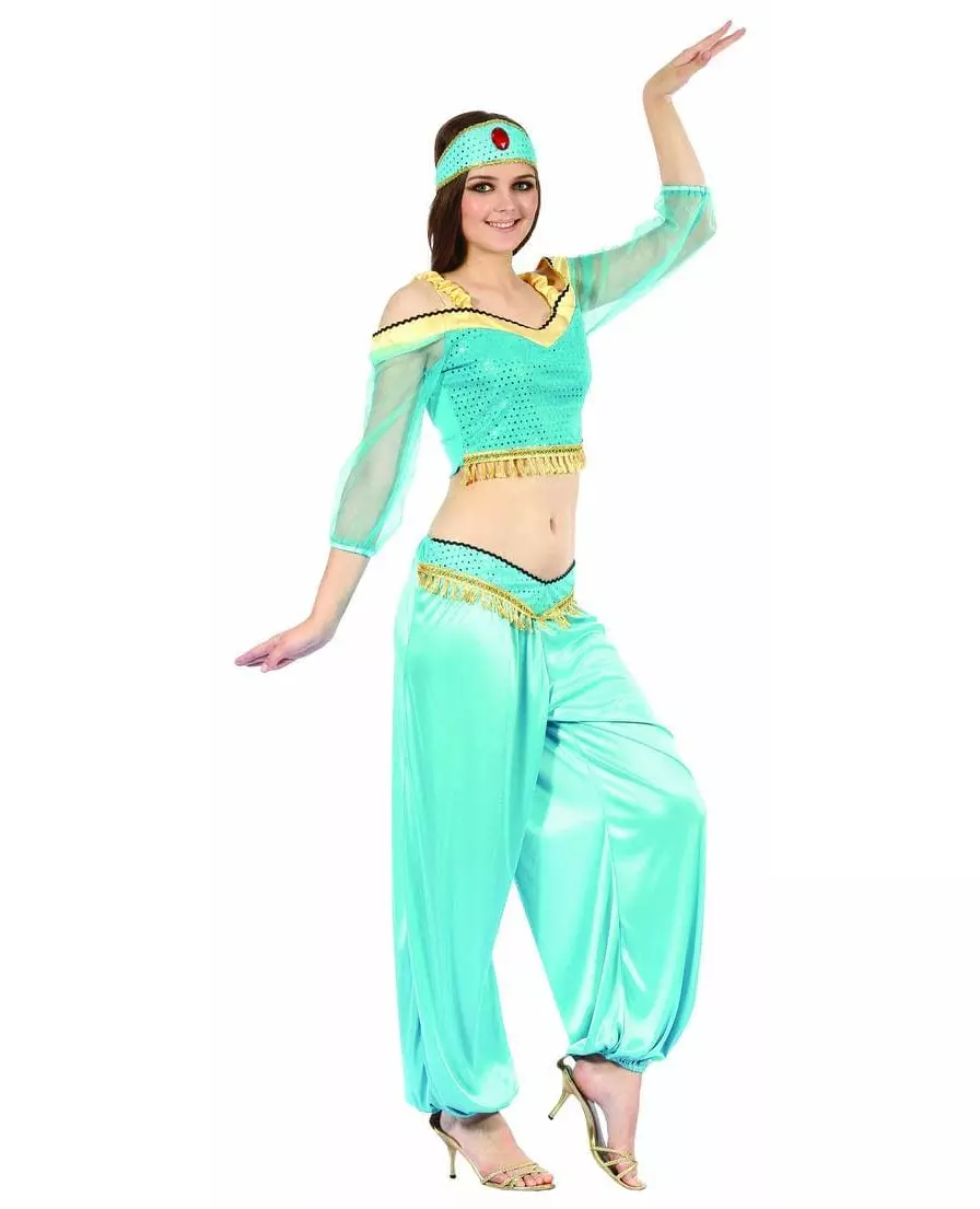 Fortryl gjestene dine! Dette kostymet for voksne forestiller en orientalsk danser. Det inkluderer en topp, bukser og et hårbånd (sko ikke inkludert). Den korte toppen avslører magen. Den har en lav halsutringning og to rynkede gule stropper for støtte. Forsiden av T-skjorten er turkisblå med sølvfargede strass-steiner, mens baksiden er enkel. 3/4-ermene er laget av fin voile. Nederdelen av denne T-skjorten har små gule frynser. De løstsittende buksene er i samme turkisblå farge. Strikk ved anklene skaper en puffy effekt. Et bånd med strass-steiner og gullfargede frynser ved magen matcher toppen. Pannebåndet er i lignende toner, med sølvfargede strass-steiner og en stor rød stein i pannen. For en kveld med orientalsk tema, dans til rytmen av fløyter og trommer. Inkludert tilbehør: T-skjorte Bukser Pannebånd Materiale: 100 % polyester Vedlikehold: Håndvask