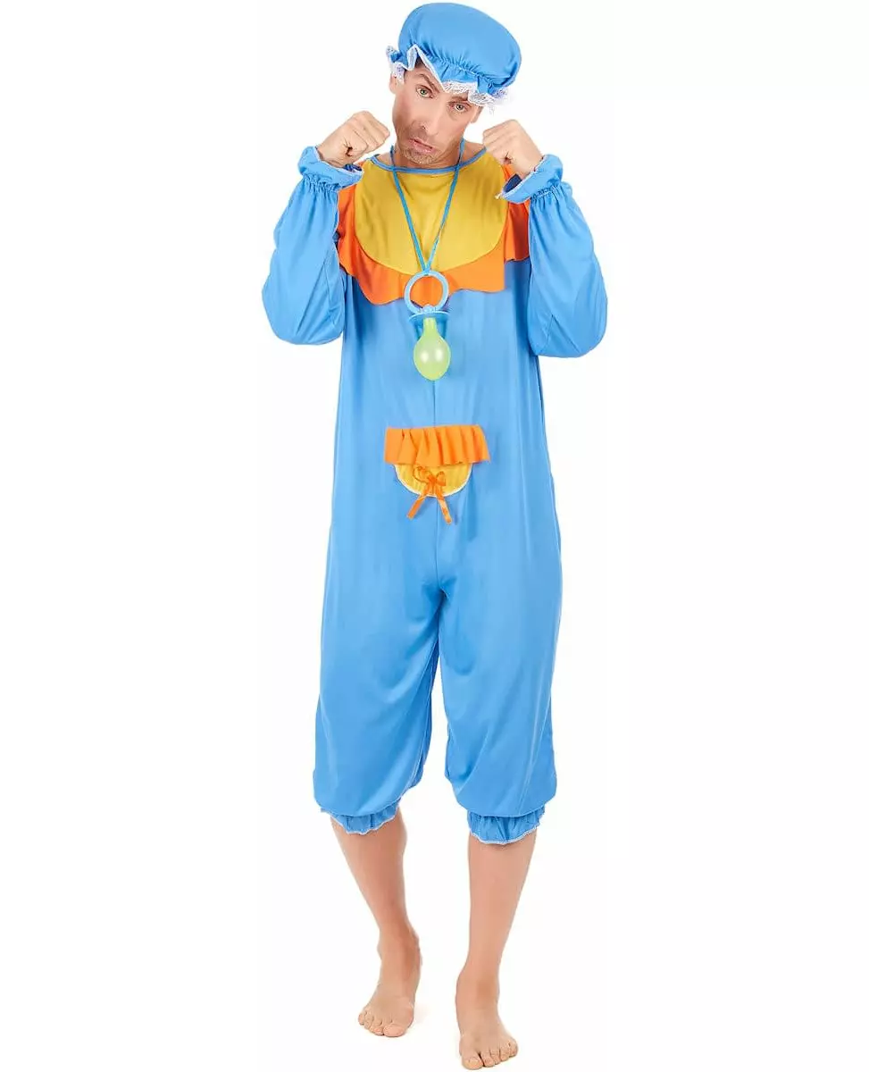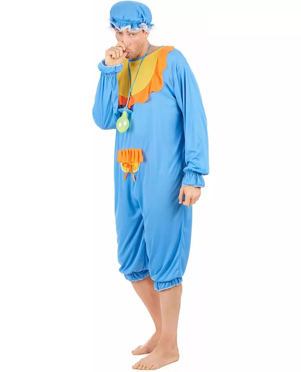 Areuh areuh! Dette babykostymet for menn består av en blå jumpsuit med beina som går under kneet. Den har to paneler på forsiden som representerer en smekke og en falsk lomme, alle i gult og oransje. (Smokk ikke inkludert) Den blå elastiske hatten pynter opp antrekket ditt og gjør deg til den vakreste babyen på kostymefester eller til et utdrikningslag. Inkludert tilbehør: Jumpsuit-hatt Materiale: 100 % polyester Stell: For hånd Målinformasjon: Jumpsuitens lengde er 130 cm, midjeomkrets er ca. 68 cm, og ermene måler ca. 66 cm.