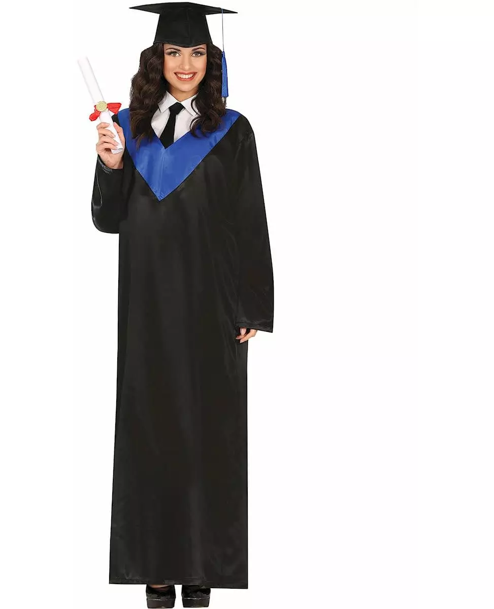 Klar for konfirmasjon! Dette blå og svarte konfirmasjonskostymet for voksne består av en lang tunika og en matchende seremoniell hatt. Den svarte tunikaen, med lange ermer, har en blå sateng V-formet krage som minner om antrekkene som brukes på konfirmasjonsseremonier. Den firkantede hatten, med sin blå pompong, fullfører antrekket perfekt. Ideelt for en temafest eller et show! Materiale: Tekstil. Inkludert tilbehør: 1 hatt 1 tunika