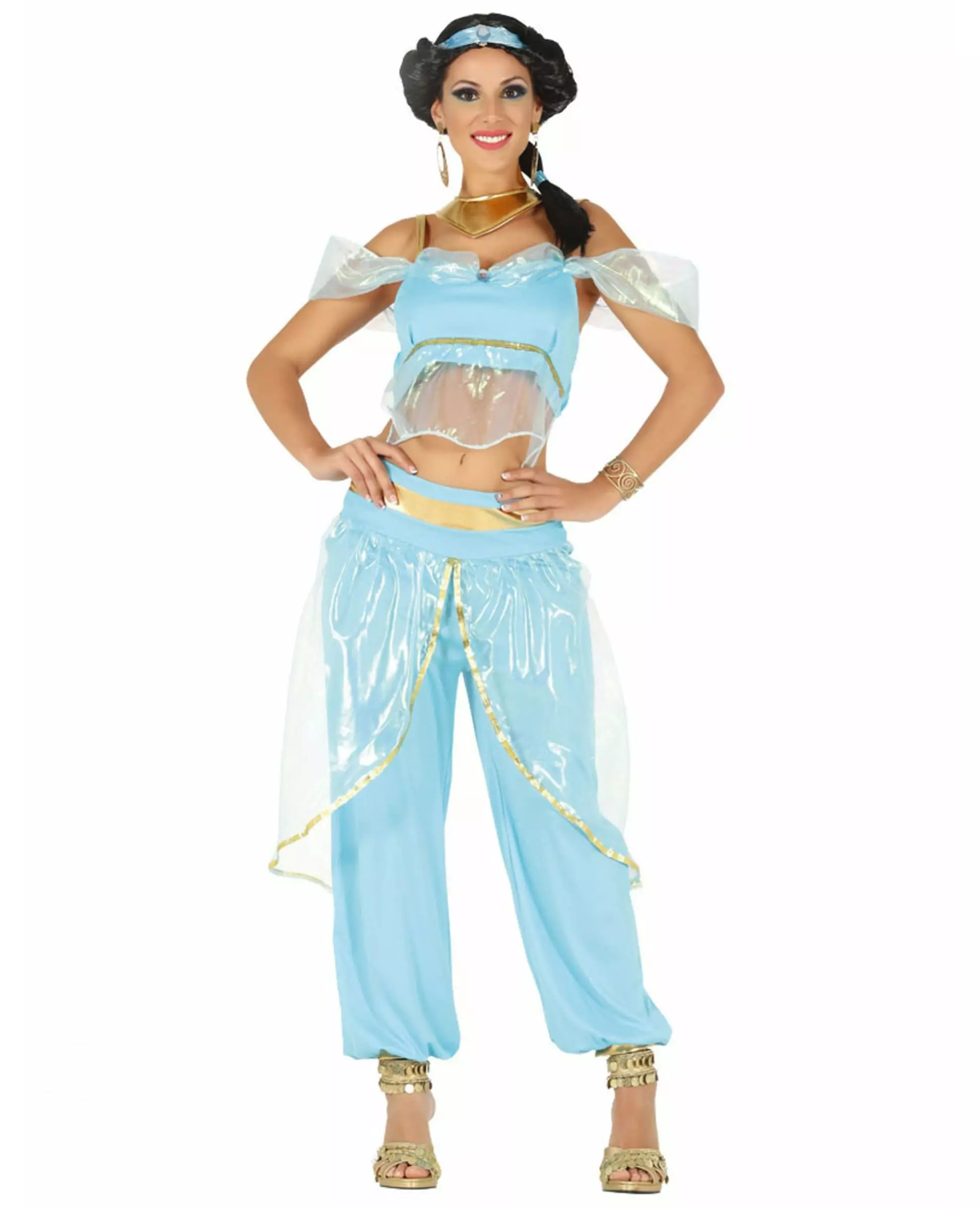 Føl deg som Jasmine i dette orientalske danserkostymet. Dette orientalske prinsessekostymet for kvinner består av en topp, bukser, et pannebånd og et halskjede (smykker og sko er ikke inkludert). Toppen, som er veldig kort, vil la magen din være avdekket. Den er himmelblå med slør som faller over skuldrene og magen. De matchende buksene er himmelblå med slør i livet. De er strammet ved anklene for å gi det litt fylde. Hårbåndet er også blått, med en imitert stein i midten. Til slutt fullfører et gullfarget skumkjede dette kostymet. Dette orientalske danserkostymet vil være perfekt for magedans. Inkludert tilbehør: Topp Bukser Pannebånd Halskjede Materiale: 100 % polyester Vedlikehold: Håndvask