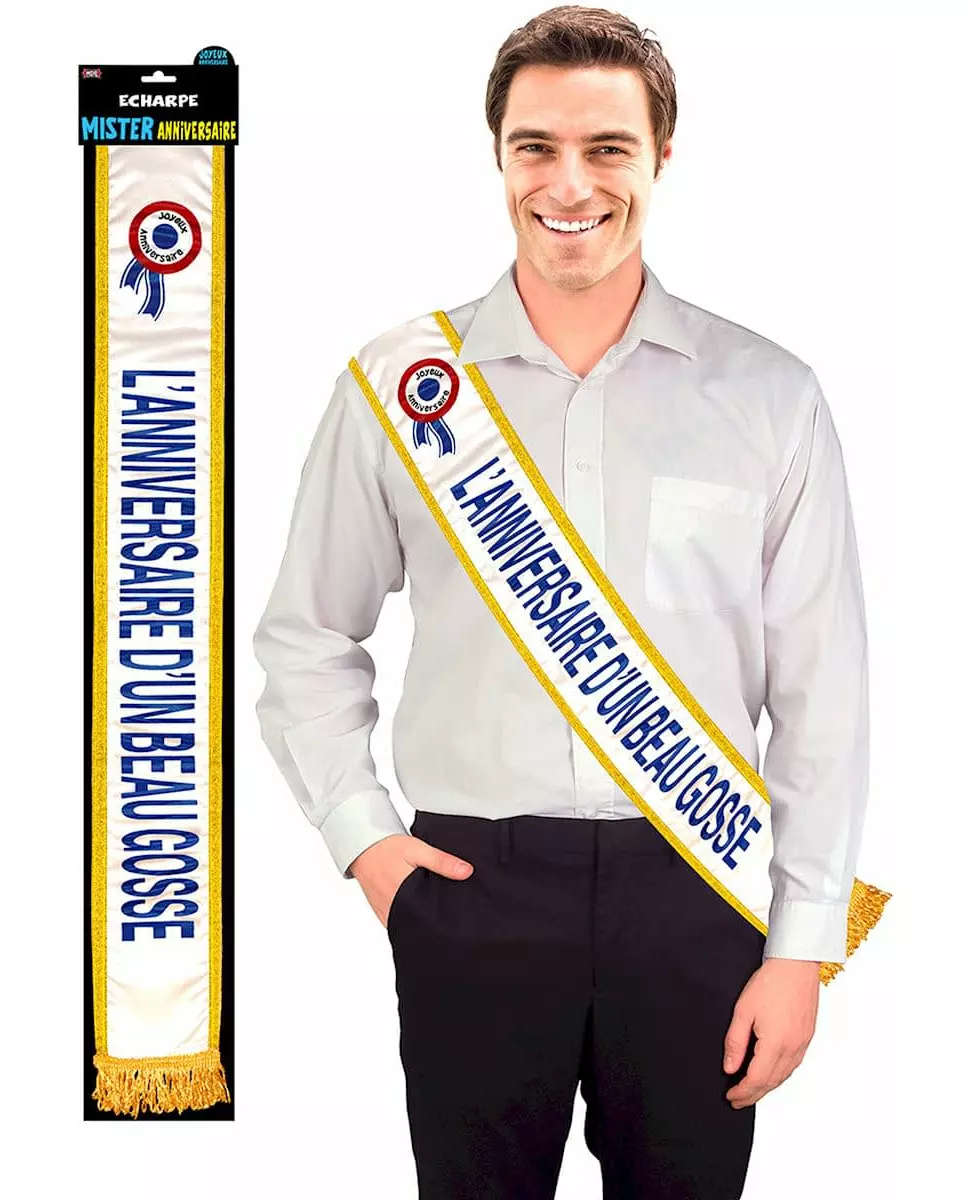 Dette herreskjerfet er laget av hvitt stoff med gullkant og ordene «A Handsome Guy's Birthday» i blått glitter. Skjerfet måler omtrent 184 cm i lengden. Det vil være perfekt til en bursdagsfest.