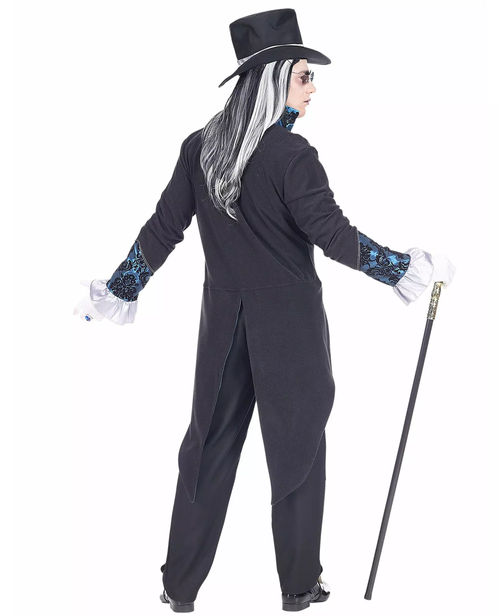 En elegant viktoriansk vampyr! Dette blå viktorianske vampyrkostymet er for menn, det består av en vestjakke, en skjorte med jabot, bukser og en flosshatt (briller, hansker, stokk og sko er ikke inkludert). Jakken er tofarget, den har svarte ermer med blå kanter og elegante trykk. Innsiden av jakken er blå. En annen jakke blander seg inn under overjakken takket være dens identiske farge og trykk. To grå falske knapper er festet til den. Skjorten er hvit med en hvit krage. Jaboten slutter seg til denne skjorten, denne jaboten er svart med en hvit kant. Det gir det ønskede elegante utseendet. Buksene er svarte for å kobles til jakken. Flosshatten er svart dekorert med et hvitt bånd. Dette svært elegante viktorianske vampyrkostymet vil være perfekt for deg på Halloween-festen din. Tilbehør inkludert - Jakke - Skjorte og jabot - Bukser - Hatt
