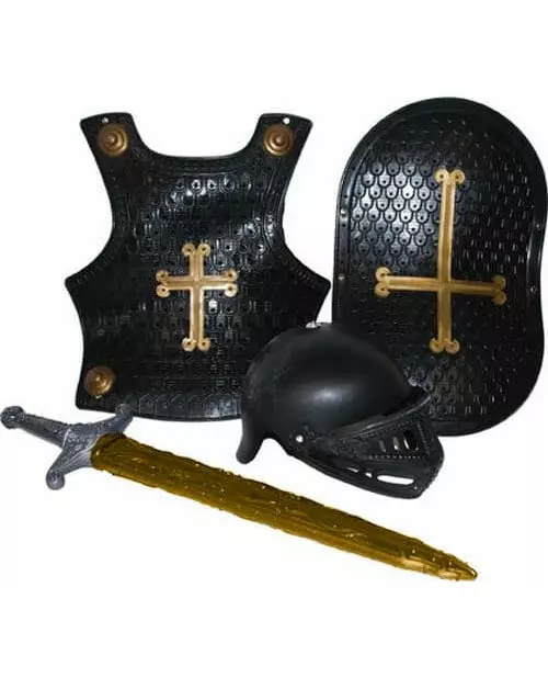 Forvandle din væpner til en ekte ridder! Dette kostymesettet for barn er laget av plast. Det inneholder 4 deler for å lage en svart ridderrustning: - 1 brystplate som måler 40 x 32 cm. Stropper gjør at den fremre delen av rustningen kan bæres på skuldrene. - 1 hjelm med en diameter på 16 cm. En del av hjelmen glir foran øynene. - 1 sverd som måler 56 cm i sverdets lengde. To hakk er tilgjengelige for å føre beltet gjennom etuiet. Sverdet er sølvfarget og sliren er gullfarget. - 1 skjold som måler 40 x 27 cm. Det kan bæres på armen takket være stroppene. Alle gjenstander er svarte og dekorert med gyldne middelalderkors. Symboler som blomster eller topper gir realisme til rustningens netting. Til bursdagen eller en kostymefest vil den lille gutten din ha et vakkert utseende av en middelaldermester. Inkludert tilbehør: Hjelm Brystplate Skjold Sverd Materiale: Plast