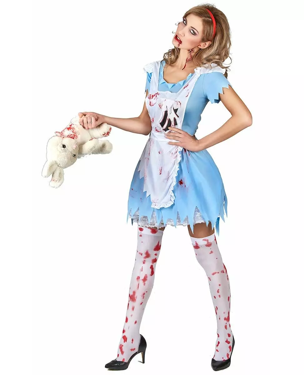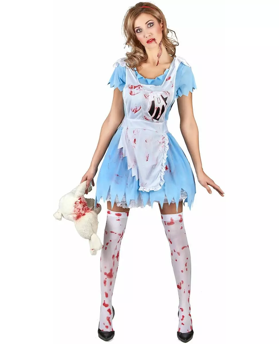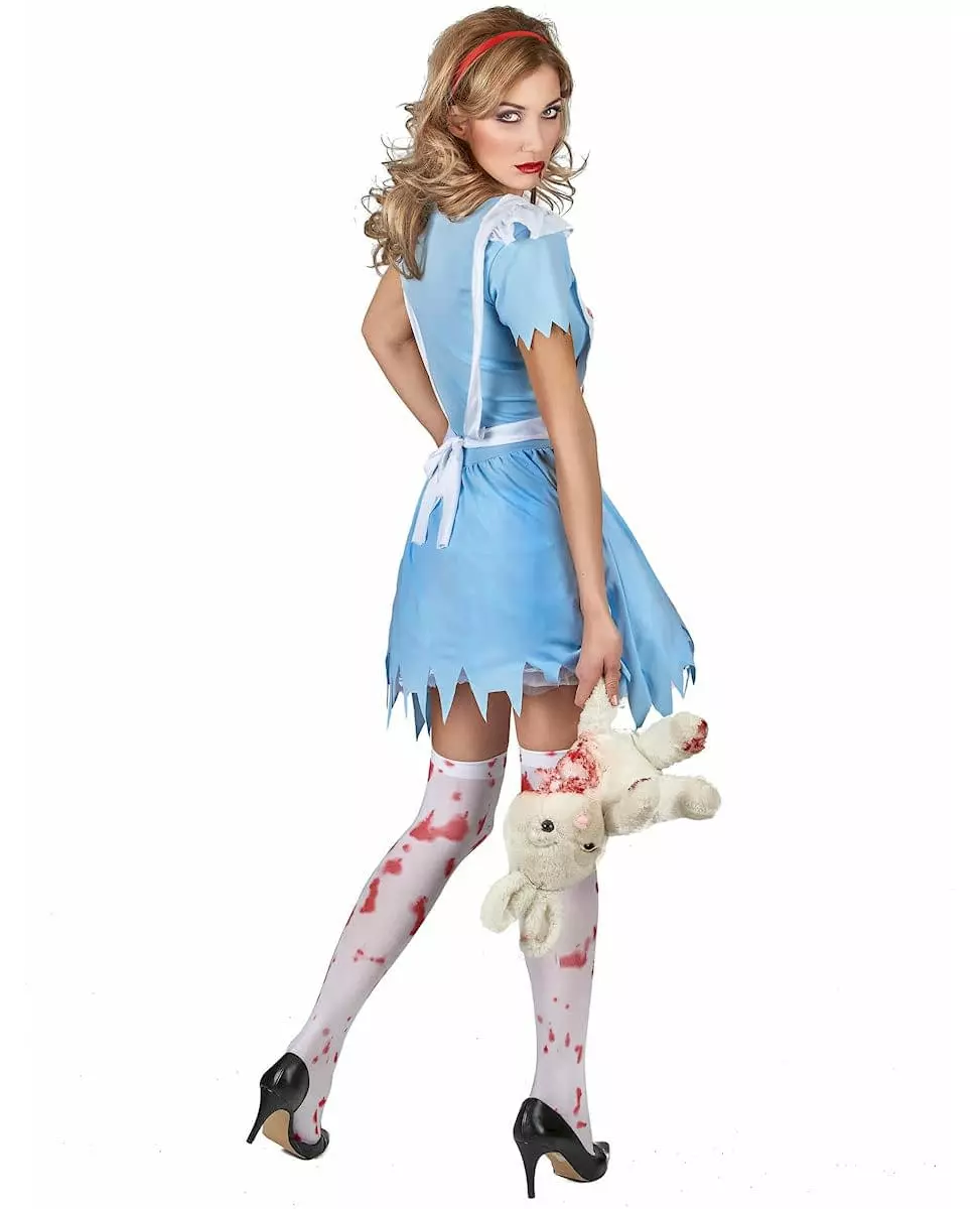 Det er for sent nå. Dette Alice Halloween-kostymet er for kvinner og inkluderer en kjole, et forkle og et pannebånd. Den korte kjolen er laget av fint himmelblått stoff. Kragen, ermene og bunnen av kjolen er kuttet i spisser, og det hele er dekket av falske blodflekker. Forkleet med revne og blodige effekter glir på som en ryggsekk forfra og festes bak i midjehøyde. Til slutt er pannebåndet laget av myk plast dekket med rødt stoff. Det vil perfekt pynte opp løse hår eller knuten din. Dette blodige settet rett ut av en skrekkfilm vil være perfekt for å se vakker og skummel ut på en utkledningsfest som Halloween!. Inkludert tilbehør: Kjole, forkle, pannebånd. Materiale: 100 % polyester. Stell: Håndvaskbar.
