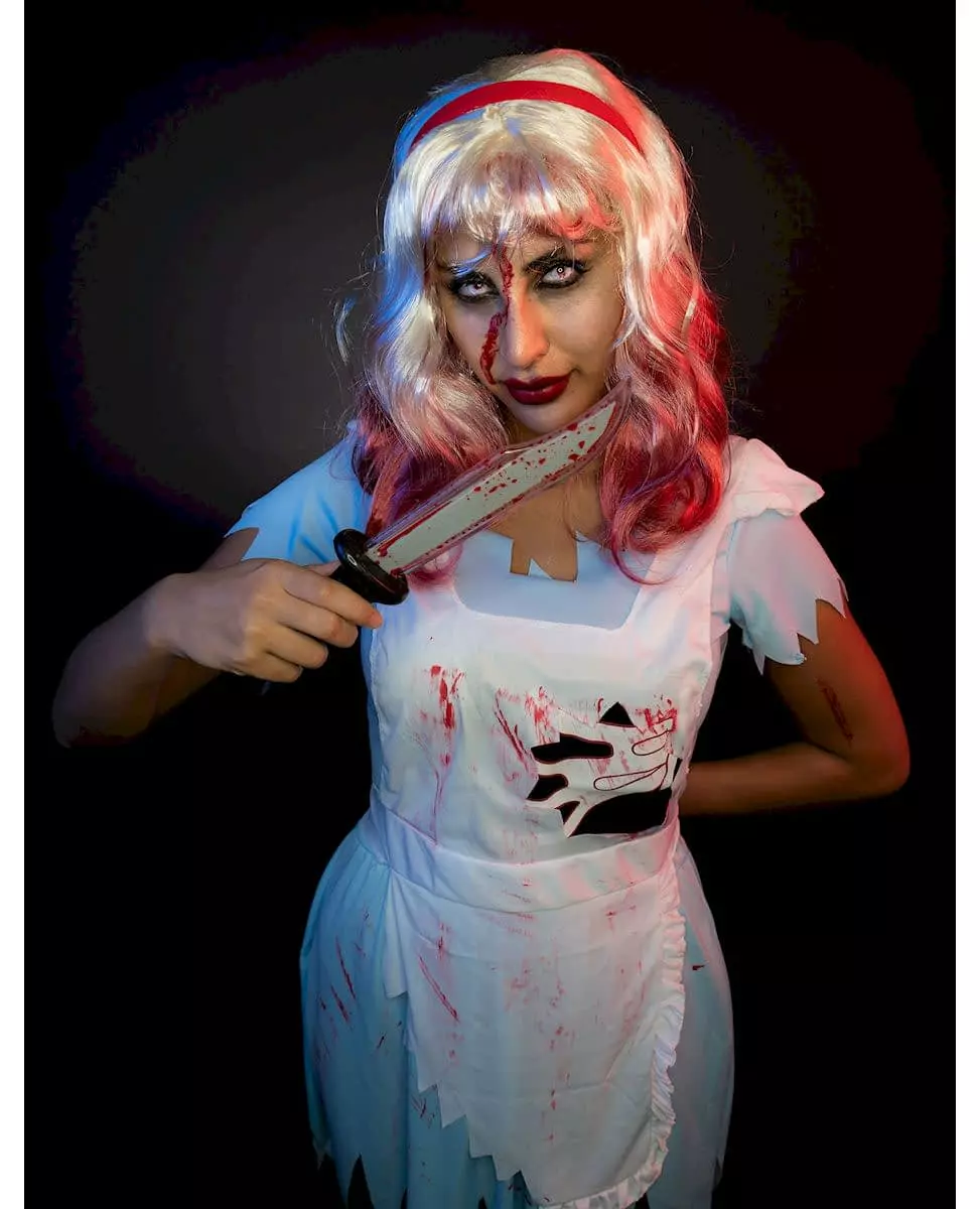 Det er for sent nå. Dette Alice Halloween-kostymet er for kvinner og inkluderer en kjole, et forkle og et pannebånd. Den korte kjolen er laget av fint himmelblått stoff. Kragen, ermene og bunnen av kjolen er kuttet i spisser, og det hele er dekket av falske blodflekker. Forkleet med revne og blodige effekter glir på som en ryggsekk forfra og festes bak i midjehøyde. Til slutt er pannebåndet laget av myk plast dekket med rødt stoff. Det vil perfekt pynte opp løse hår eller knuten din. Dette blodige settet rett ut av en skrekkfilm vil være perfekt for å se vakker og skummel ut på en utkledningsfest som Halloween!. Inkludert tilbehør: Kjole, forkle, pannebånd. Materiale: 100 % polyester. Stell: Håndvaskbar.