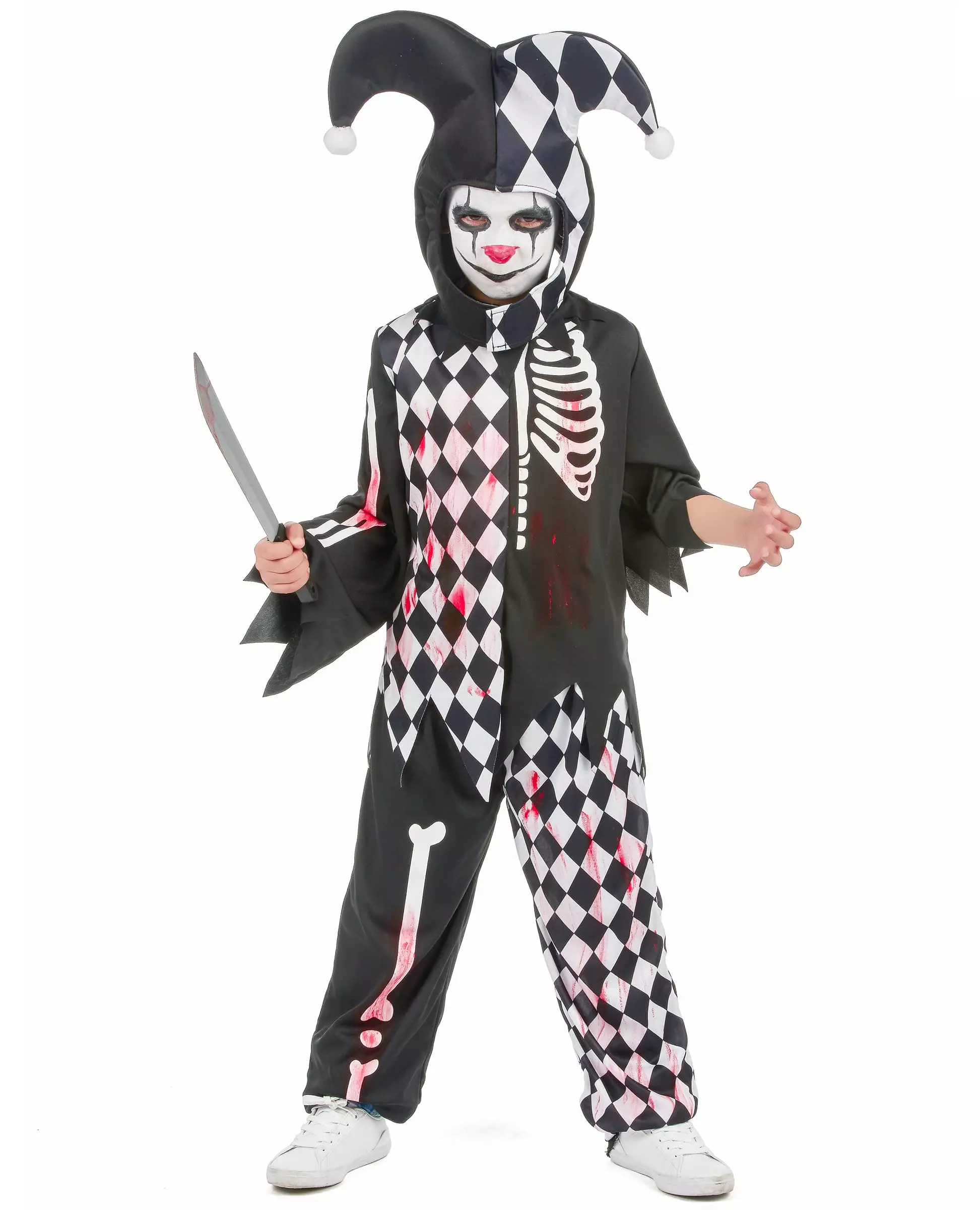 Perfekt til Halloween! Dette blodige harlekinkostymet for gutter inkluderer en topp, bukser og en hatt. Hele kostymet er delt inn i to deler, den ene siden er svart med blodige bein og den andre siden er svart og hvit rutete med blodflekker. Kongens narrehatt er svart på høyre side og svart og hvit rutete på venstre side med to hvite pomponger. Toppen er rutete på høyre side og svart på venstre side med det blodige ribbeina. Buksene er svarte på høyre side med to hvite bein og sjakkbrett på venstre side. Dette harlekinkostymet vil være perfekt til Halloween-kvelden! Inkludert tilbehør: Tunikabukser Hatt Materiale: Polyester Stell: Håndvask