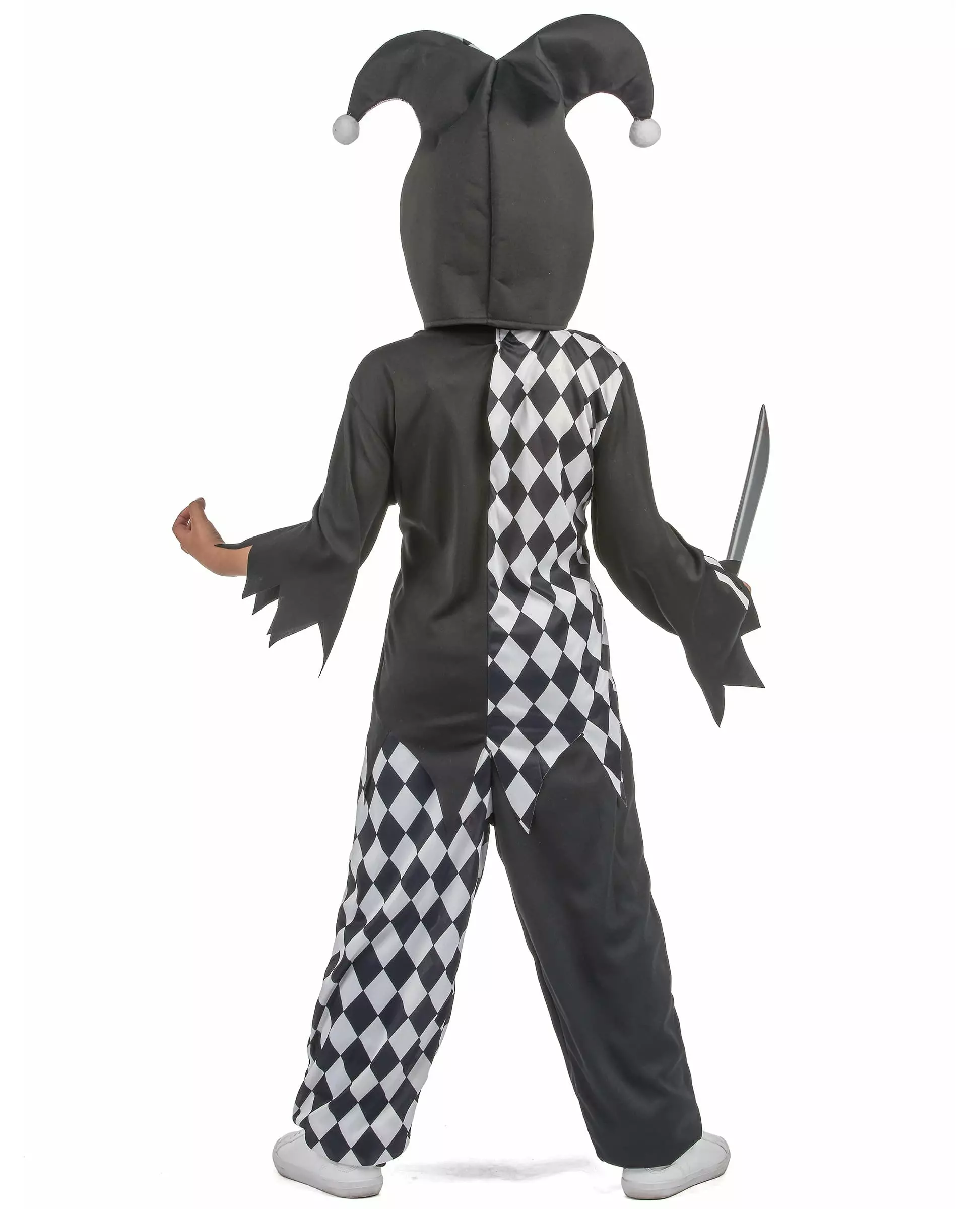 Perfekt til Halloween! Dette blodige harlekinkostymet for gutter inkluderer en topp, bukser og en hatt. Hele kostymet er delt inn i to deler, den ene siden er svart med blodige bein og den andre siden er svart og hvit rutete med blodflekker. Kongens narrehatt er svart på høyre side og svart og hvit rutete på venstre side med to hvite pomponger. Toppen er rutete på høyre side og svart på venstre side med det blodige ribbeina. Buksene er svarte på høyre side med to hvite bein og sjakkbrett på venstre side. Dette harlekinkostymet vil være perfekt til Halloween-kvelden! Inkludert tilbehør: Tunikabukser Hatt Materiale: Polyester Stell: Håndvask