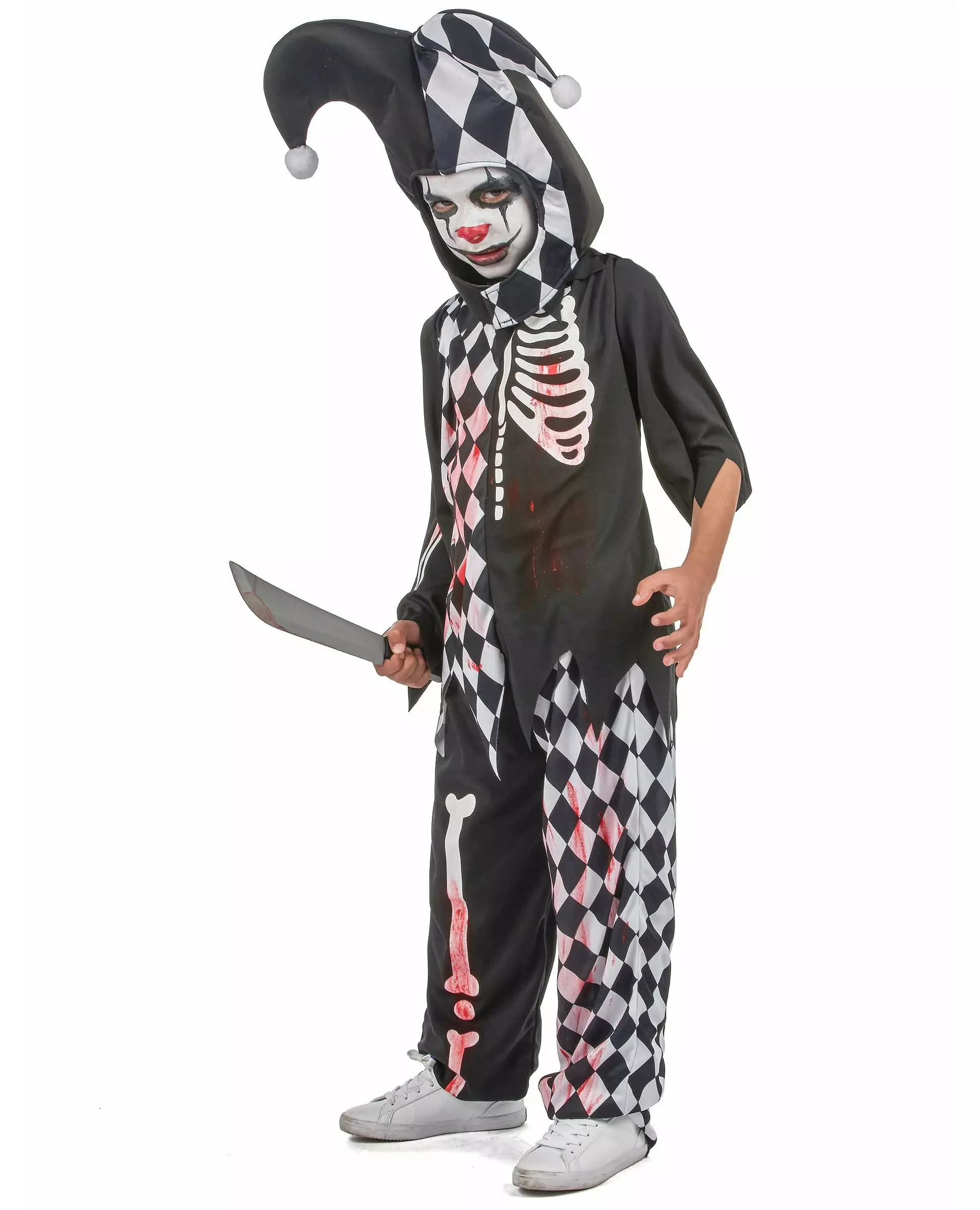 Perfekt til Halloween! Dette blodige harlekinkostymet for gutter inkluderer en topp, bukser og en hatt. Hele kostymet er delt inn i to deler, den ene siden er svart med blodige bein og den andre siden er svart og hvit rutete med blodflekker. Kongens narrehatt er svart på høyre side og svart og hvit rutete på venstre side med to hvite pomponger. Toppen er rutete på høyre side og svart på venstre side med det blodige ribbeina. Buksene er svarte på høyre side med to hvite bein og sjakkbrett på venstre side. Dette harlekinkostymet vil være perfekt til Halloween-kvelden! Inkludert tilbehør: Tunikabukser Hatt Materiale: Polyester Stell: Håndvask