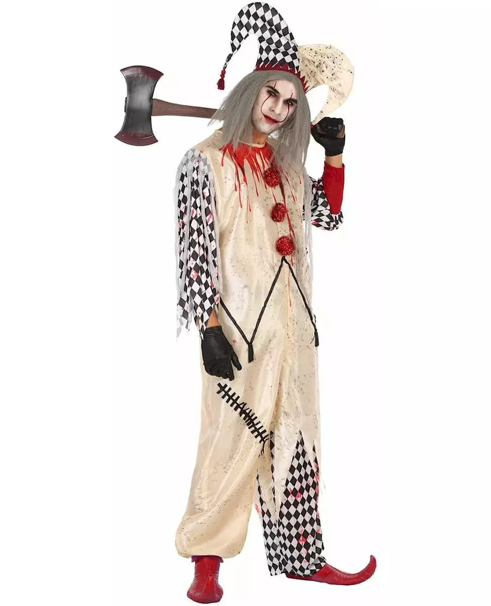 En blodtørstig harlekin! Dette blodige harlekin-kostymet er for menn. Det inkluderer en hatt og en jumpsuit (øks, hansker og sko er ikke inkludert). Hatten er en tofarget narrehatt i off-white med flekker og svarte og hvite diamanter. Den har også pomponger og en rad blodrøde diamanter. Jumpsuiten, med lange spisse ermer for en revet effekt, er også tofarget. Den glir på og lukkes bak med glidelås. Ermene og den nedre delen av det ene benet er i svarte og hvite diamanter, det tradisjonelle mønsteret til harlekin-karakteren. Resten av jumpsuiten er off-white med en rad røde pomponger og bloddrypp ved kragen. Gå for en skummel og blodig stil og spill en legendarisk karakter i dette blodige harlekin-kostymet på Halloween-kvelden!. Inkludert tilbehør: Hatt Jumpsuit Materiale: Polyester Stell: Håndvask