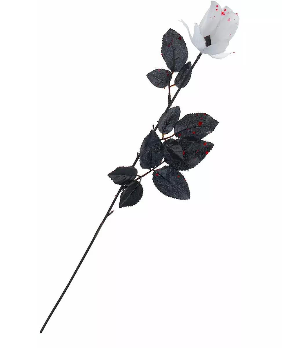 Halloween med romantikk ... Denne hvite rosen er blodig og måler 45 cm lang. Blomsten har hvite kronblader med svarte blader. De er laget av stoff med en plaststilk. Det er falske blodflekker over hele blomsten. Den vil være perfekt til dekorasjon på Halloween eller til og med for å fullføre et kostyme. Inkludert tilbehør: 1 rose Materiale: Plast, Stoff