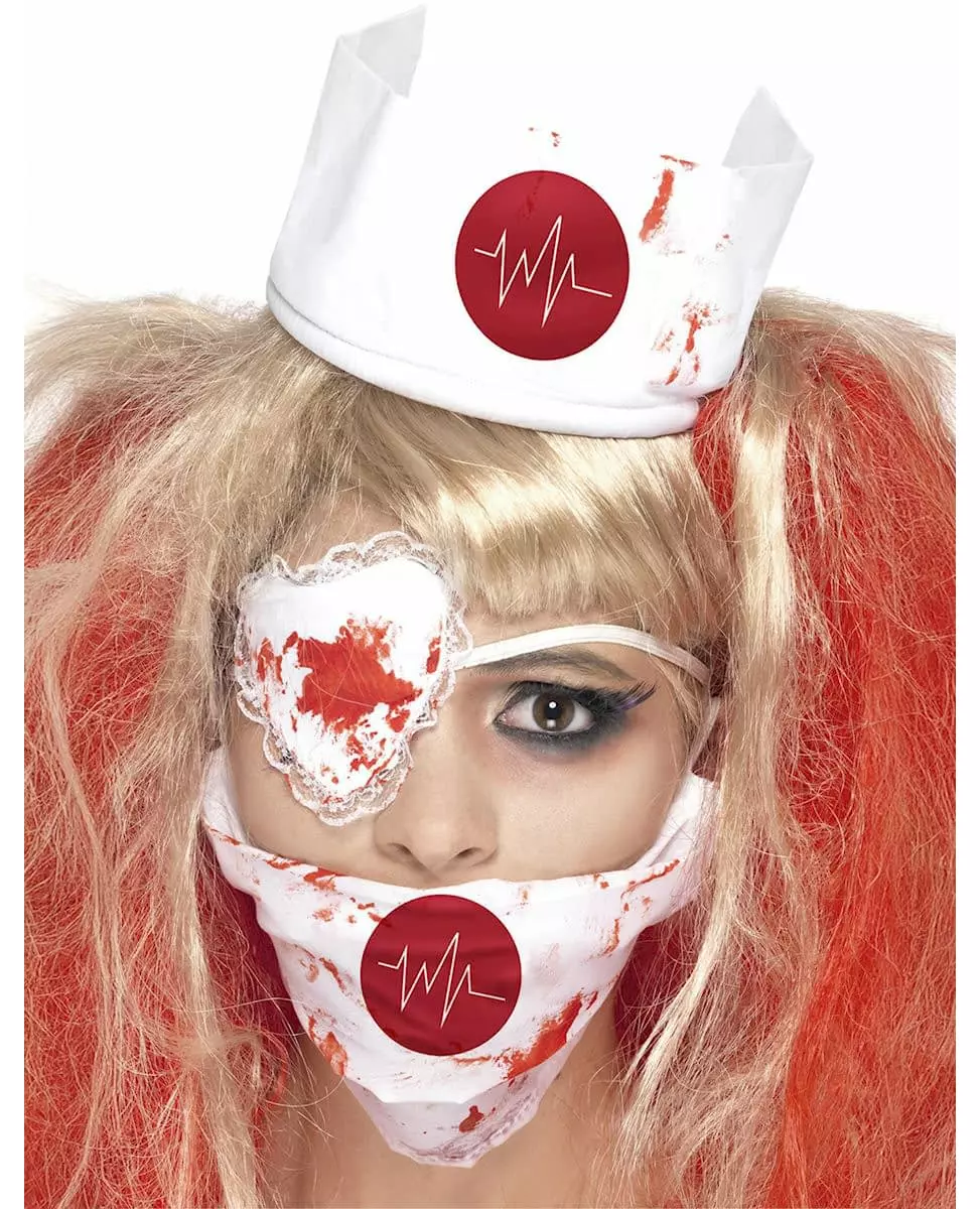 Blodig! Dette sykepleiersettet for kvinner består av en øyelapp med blonder, en maske og et pannebånd med hodeplagg. Disse elementene har røde prikker for en blodig effekt. Dette settet er ideelt for å fullføre kostymet ditt til Halloween eller under et kostymearrangement. Inkludert tilbehør: Øyelapp Maske Hodeplagg Materiale: 100 % polyester Pleie: Håndvask