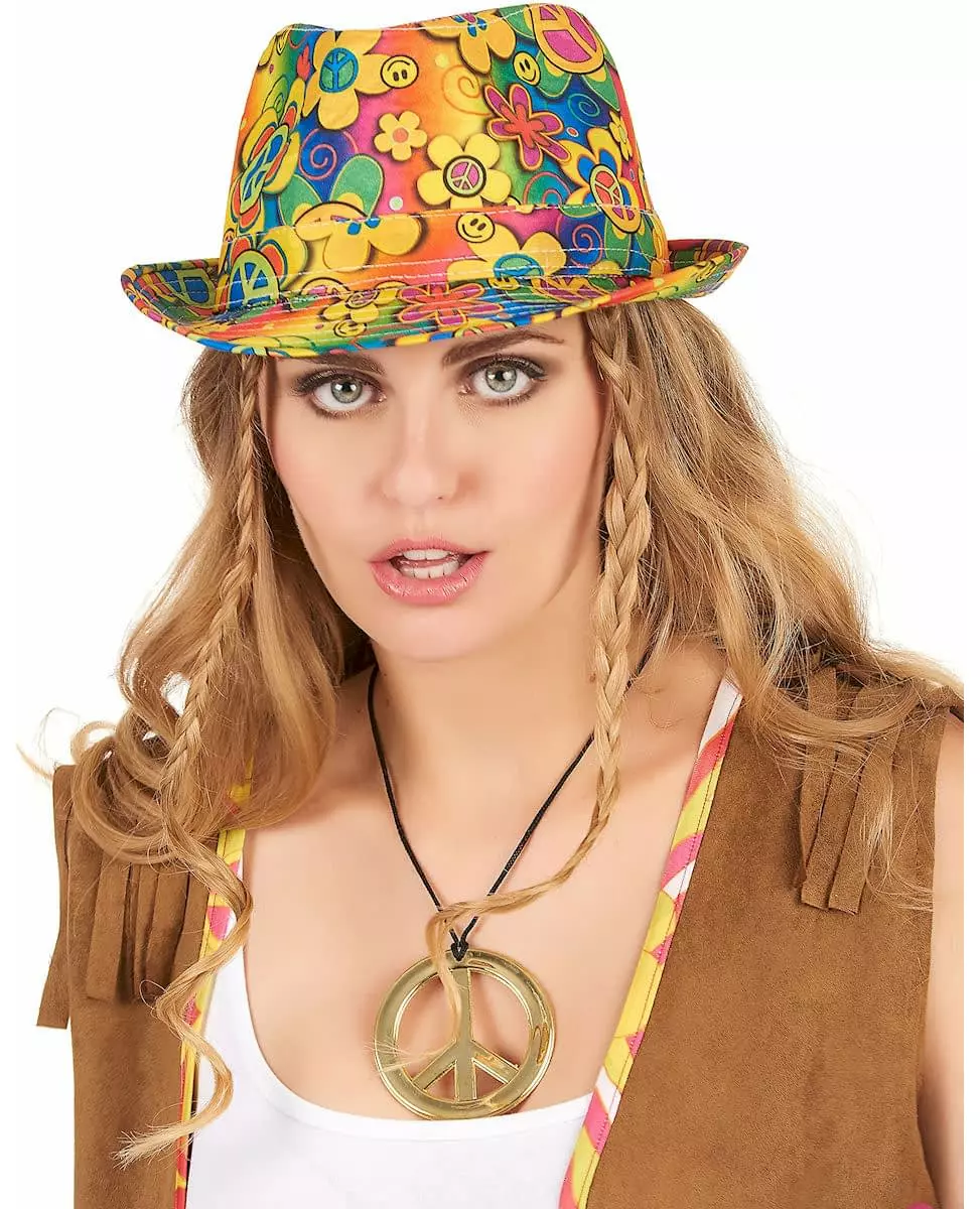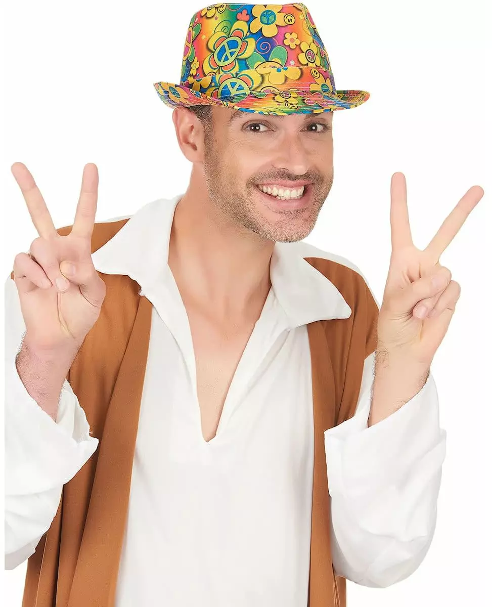 Blomsterkraft!!! Denne borsalinoen for voksne med en hodeomkrets på 58 cm er laget av stoff. Den har flerfargede blomster- og «Peace & Love»-skiltmønstre. Den vil bli et hippie-tilbehør på utkledningsarrangementet ditt, som for eksempel karnevalet! Inkludert tilbehør: Hatt Materiale: 100 % polyester 100 % polyester Pleie: Håndvask