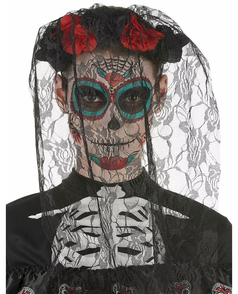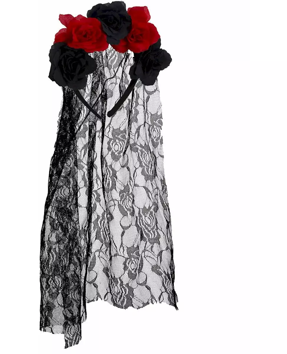 Bli en vakker Day of the Dead-calavera! Dette pannebåndet for voksne er laget av stoffblomster som minner om røde og svarte roser. Festet til rosene vil et lag med myk, svart blonder falle nedover det løse håret ditt. Dette hodeplagget vil være ideelt for kostymearrangementer som karneval eller til og med Halloween. Inkludert tilbehør: Pannebånd Materiale: Plast og polyester
