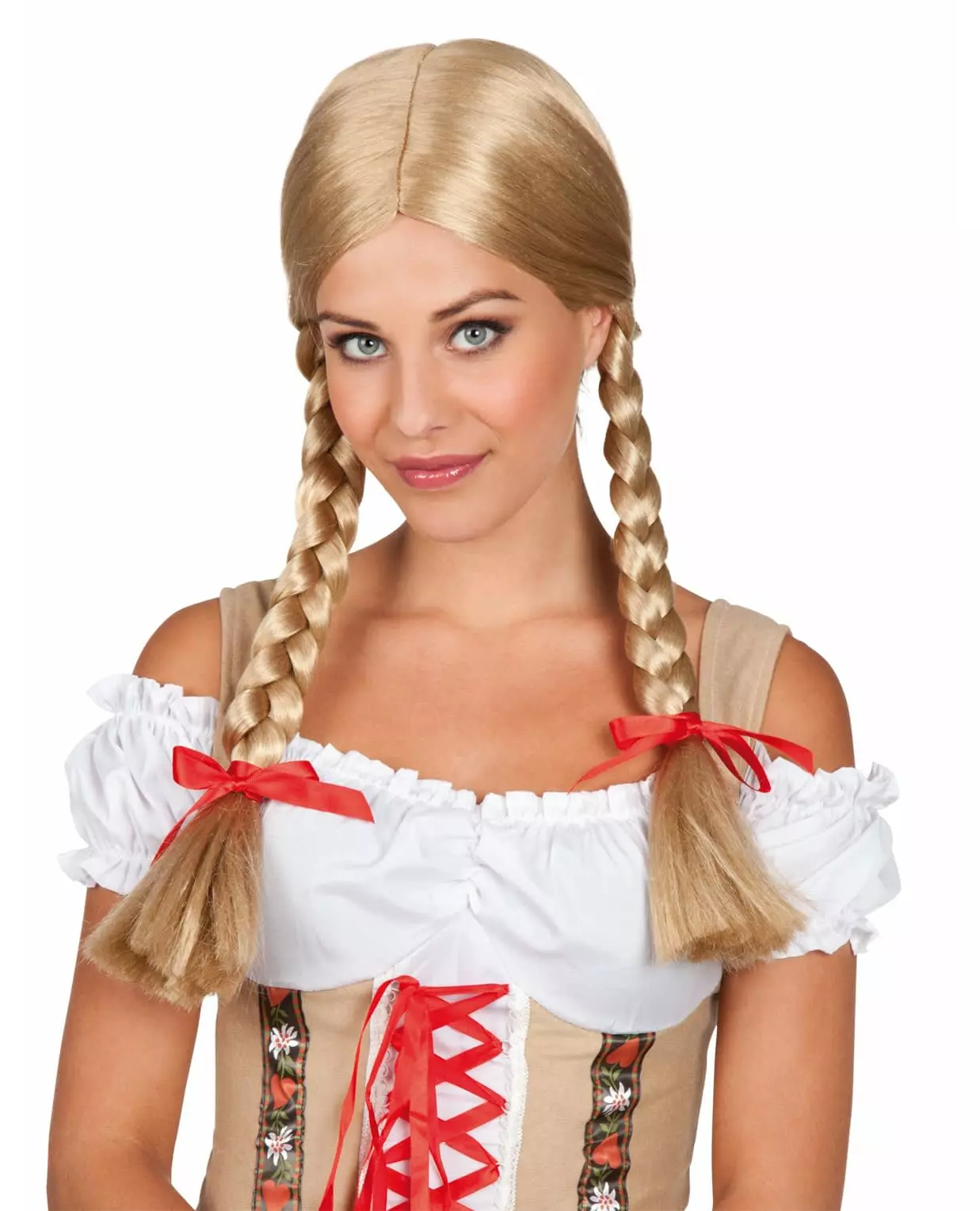 Små røde sløyfer! Denne blonde parykken for kvinner har to sidefletter. Små røde sløyfer vil fullføre håret. Denne parykken vil være ideell for å fullføre ditt bayerske kostyme under et kostyme- eller temafest. Inkludert tilbehør: Parykkmateriale: 100 % syntetisk 100 % polyester 100 % polyester