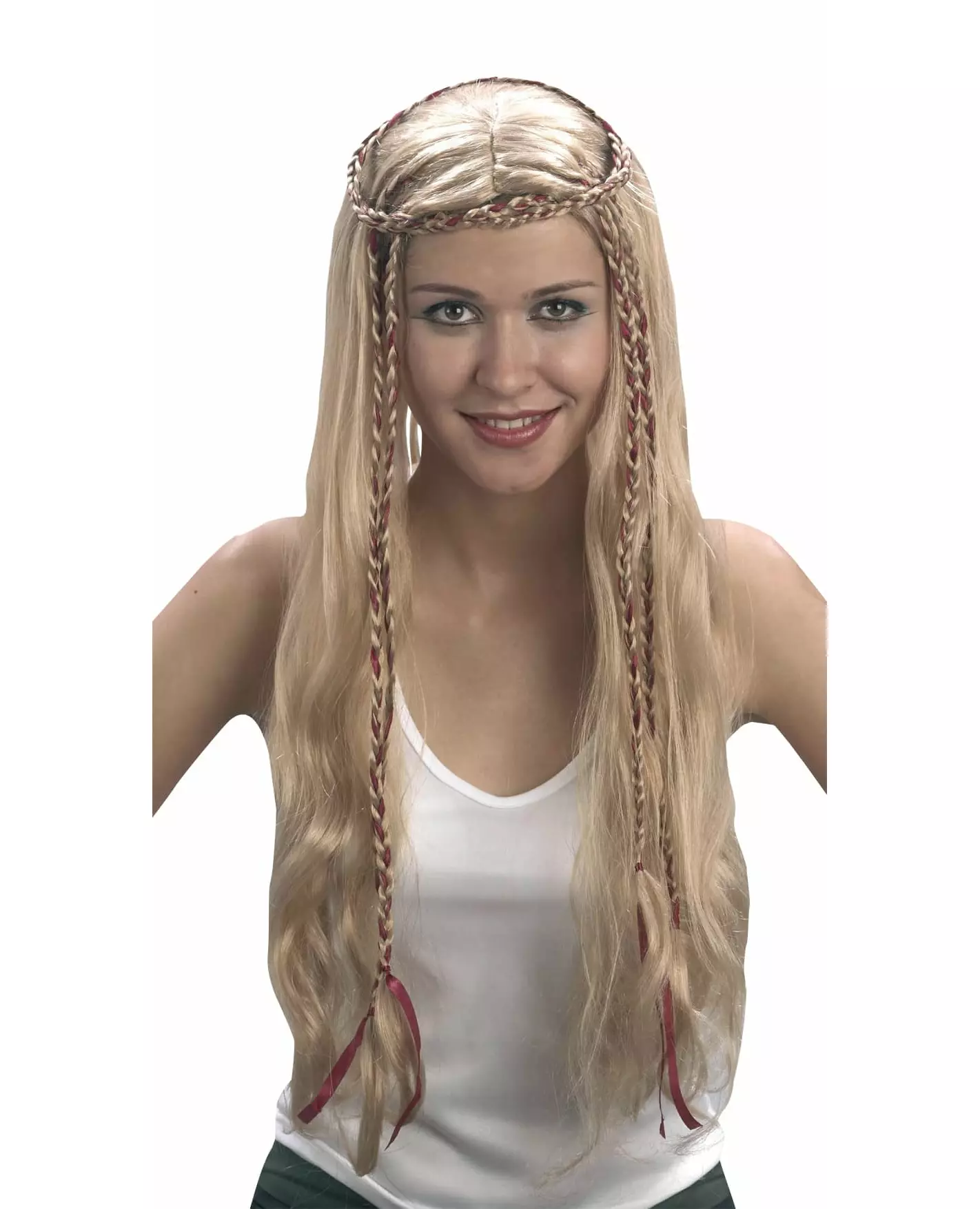 Prinsessehår! Denne middelalderparykken for kvinner er laget av langt, bølget, blondt syntetisk hår med tynne fletter på sidene. Den vil være perfekt for å fullføre middelalderdronningkostymene dine på middelaldertemafester. Inkludert tilbehør: Parykk